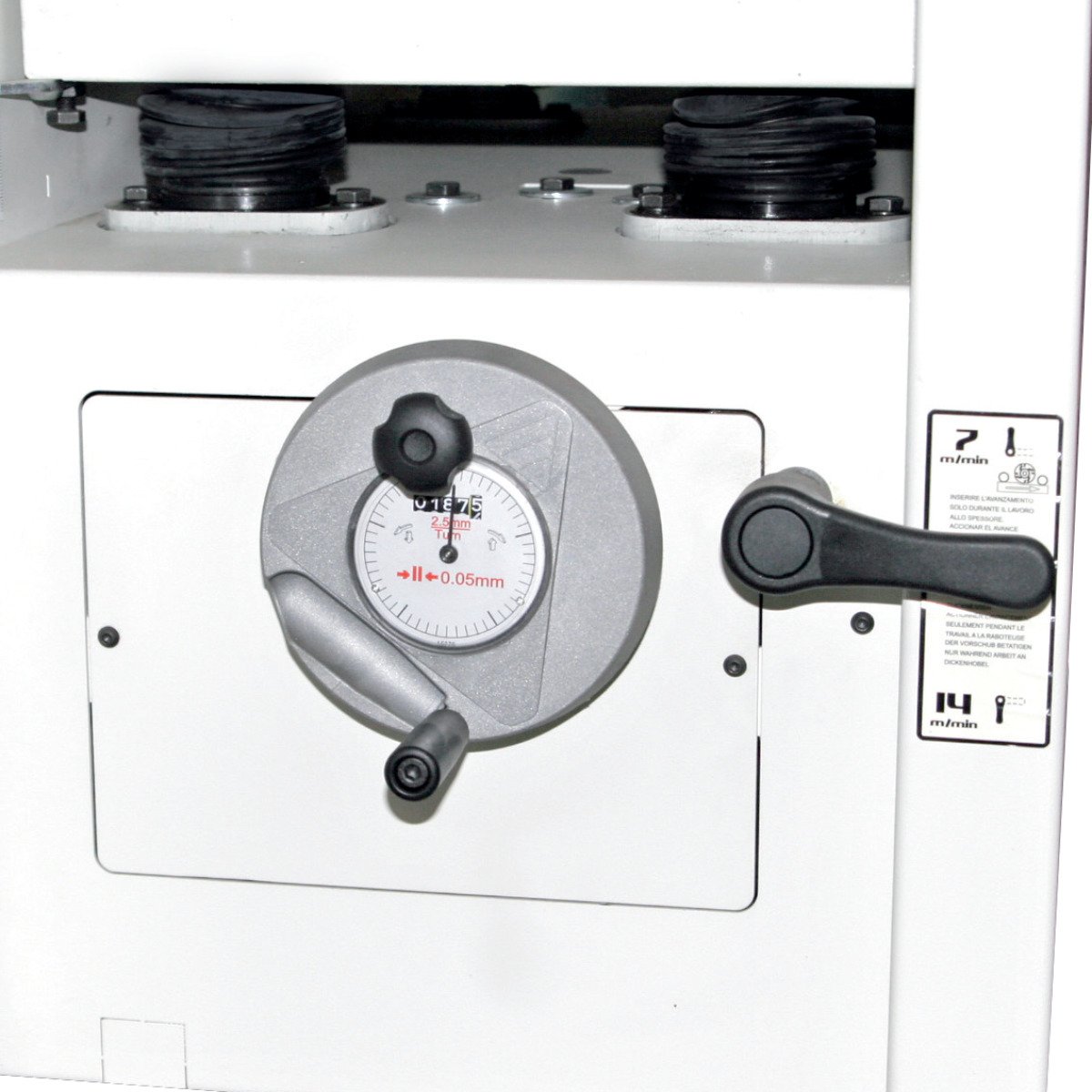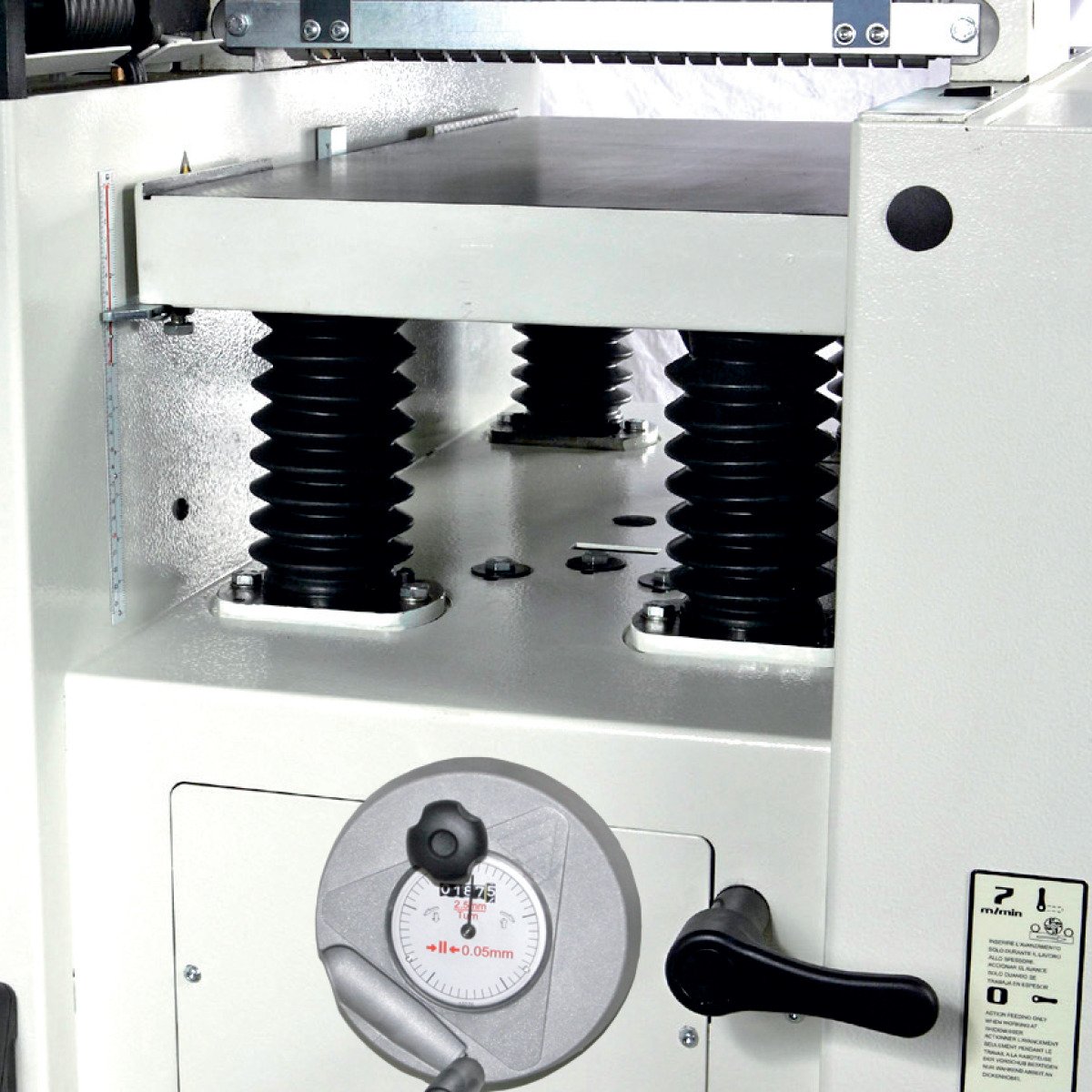 - Hobeldickentischverstellung über Handrad mit numerischer Anzeige für die Hobelhöhe