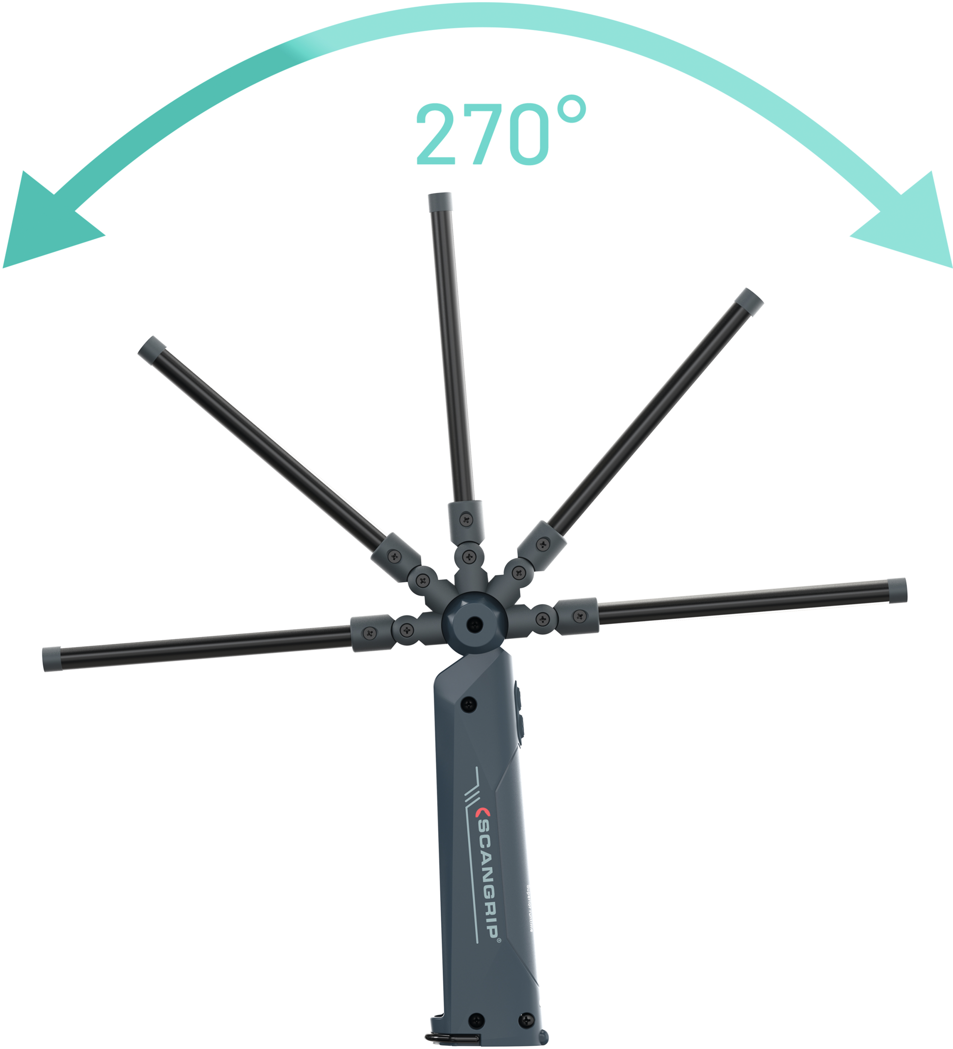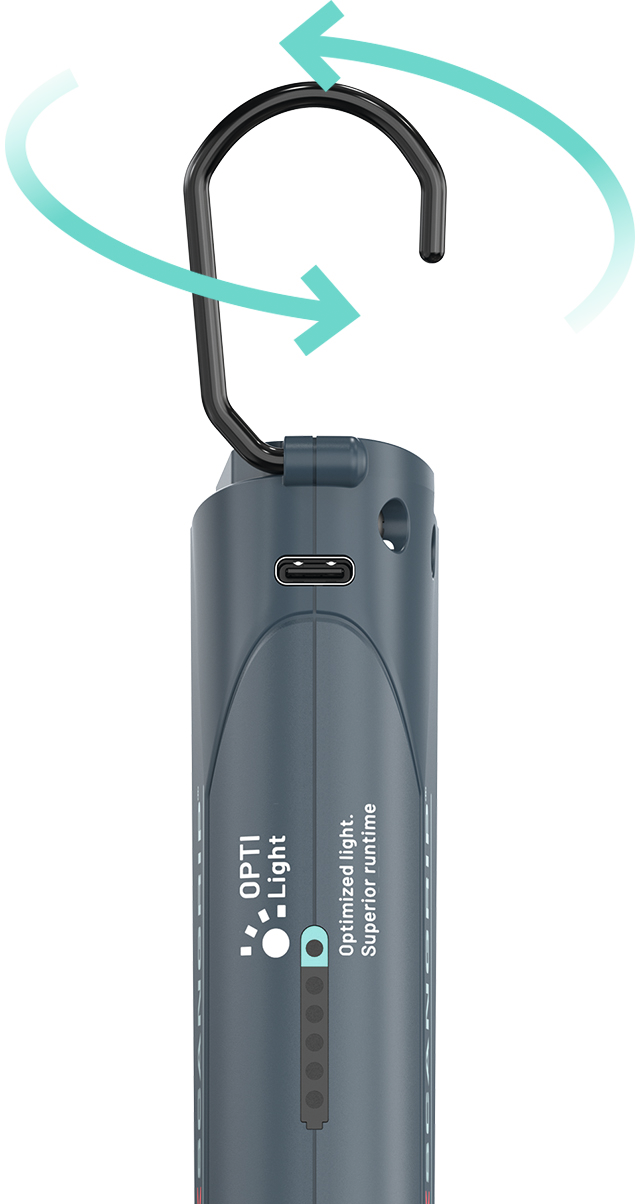 Inspektions-, Arbeitsleuchte und Taschenlampe in einem Produkt, ultra schlankes Design, bruchfestes Gehäuse und robuster Gummioberfläche, flexibler Leuchtenkopf 270° schwenkbar, OptiLight-Funktion für optimierte Beleuchtung und Laufzeit, mit Magnethalter und einziehbarem Haltebügel zur Aufhängung, Dimmfunktion in 3 Stufen, mit Ladestandsanzeige
