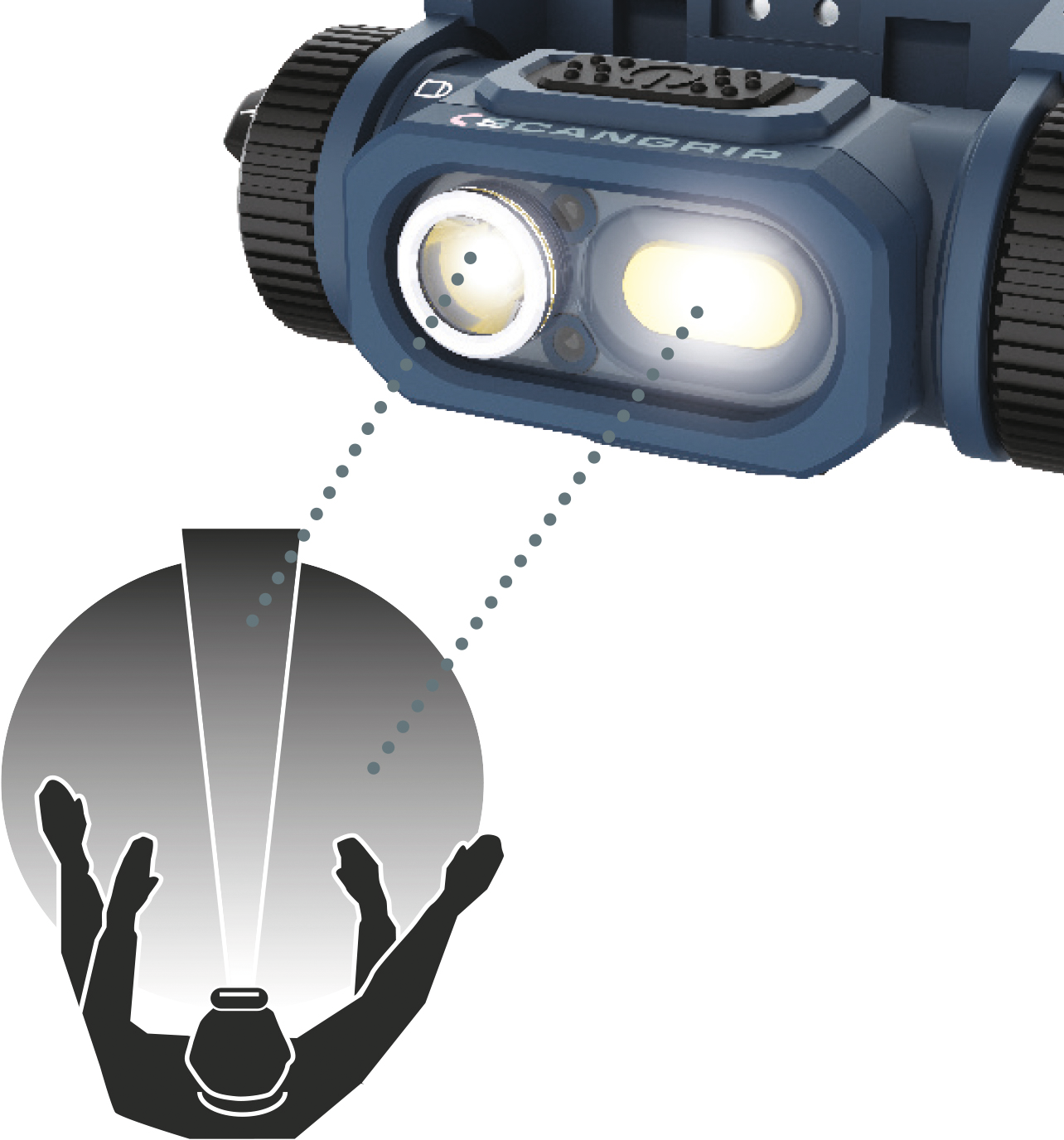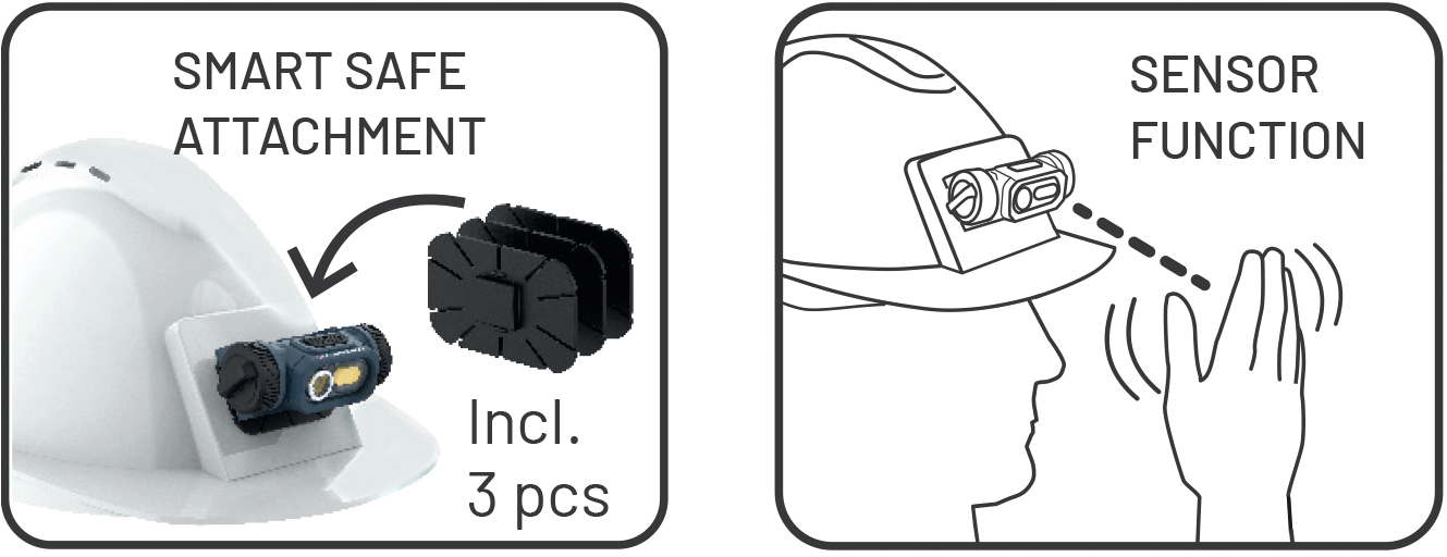 mit 1 LED, Sensorsystem zum Ein-/Ausschalten nur mit zwei Handbewegungen, beleuchtet den ganzen Arbeitsplatz und mit konzentriertem Lichtkegel für Detailarbeiten und größere Entfernungen, mit den selbstklebenden Montageplatten kann man die Lampe bequem am Schutzhelm befestigen, mit Dimmfunktion in 2 Stufen, Batteriestandsanzeige