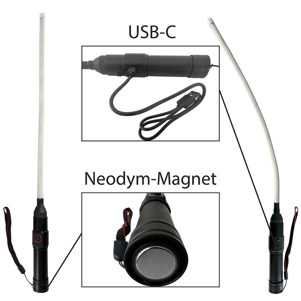Stablampe mit Li-Ionen-Akku 3,7 V/2,2 Ah, Ladekabel USB-A zu USB-C und Magnet