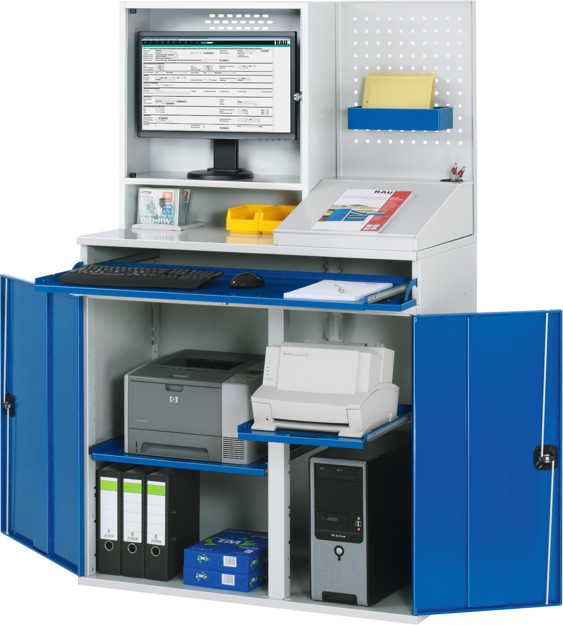 - geschweißtes Stahlblechgehäuse - Unterbaugehäuse geteilt in seperat abschließbares Tastaturfach und Flügeltürfach - Tastaturfach Höhe 120 mm mit Frontklappe oben, dahinter Auszugstablar für Tastatur und Maus - Flügeltürfach Höhe 850 mm, Einbauhöhe im Raster verstelbar - Schreibaufsatz mit Klappdeckel und Lochplatte - alle Auszüge mit Präzisionsgleitschienen - Pulverbeschichtung - Lieferung komplett montiert