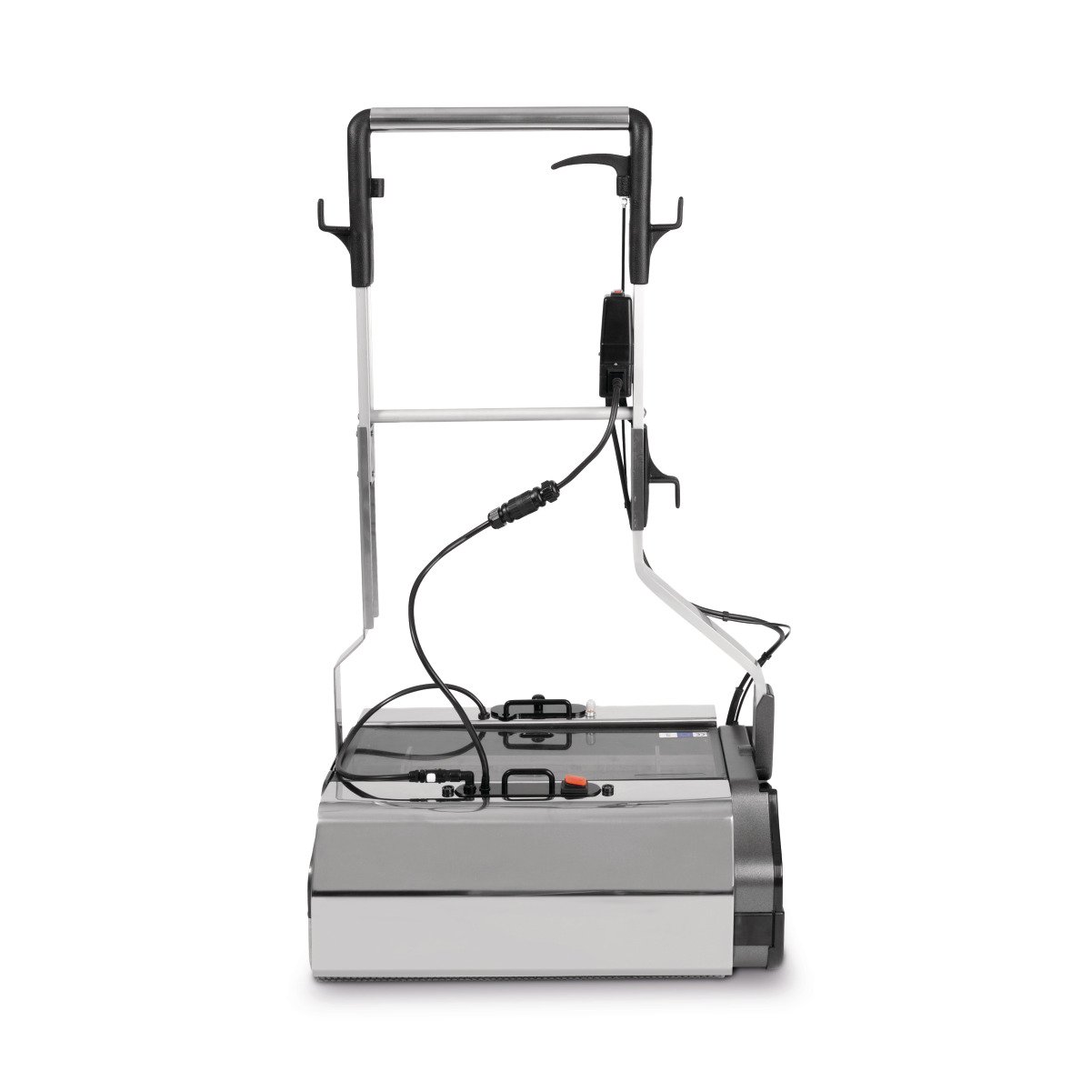 - Durch die zweiseitig ausrichtbare Deichsel lässt sich die Maschine mühelos in alle Richtungen manövrieren und macht randnahes Arbeiten auch in engen Räumlichkeiten möglich, z.B. unter Werkbänken oder Tischen