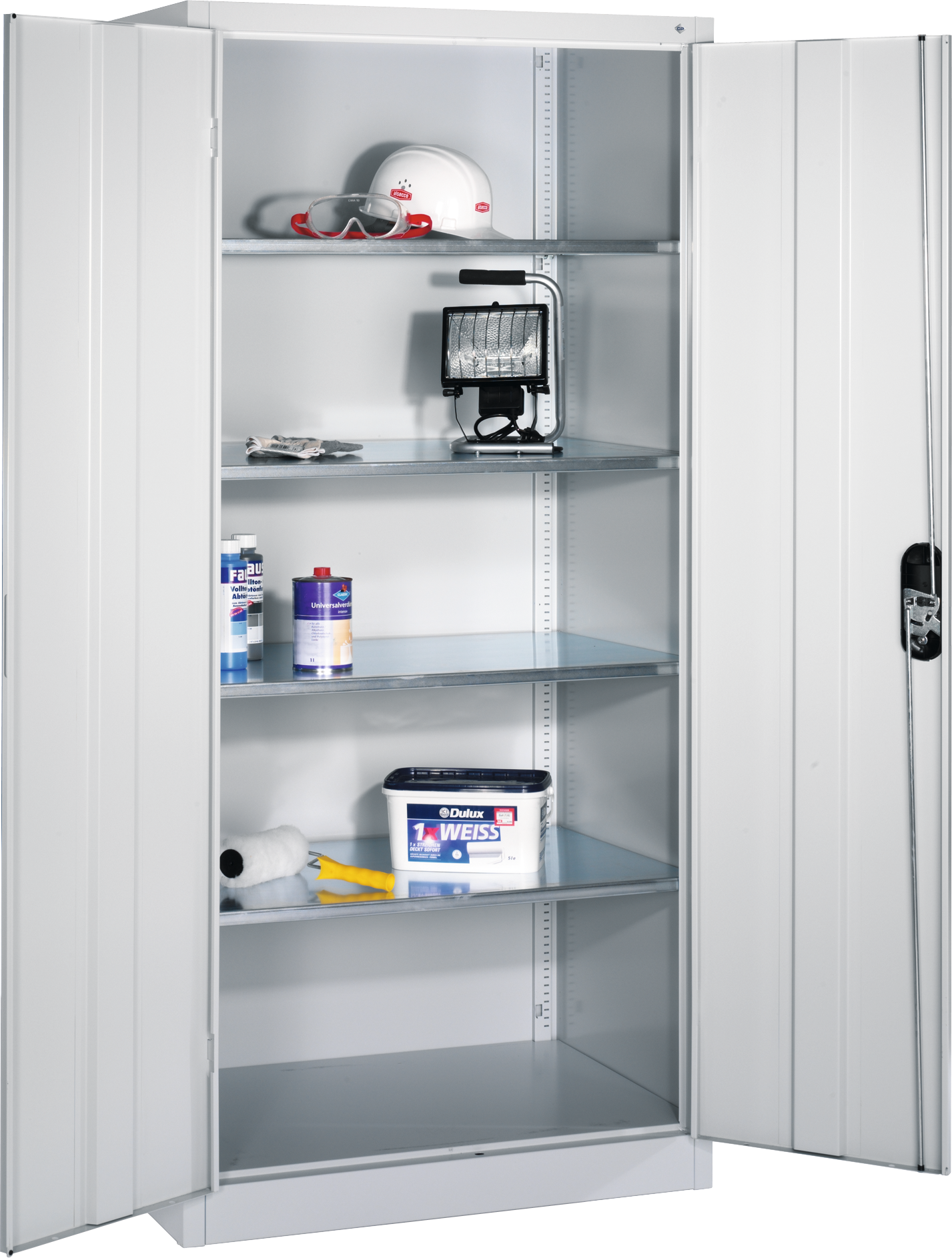 - langlebige und sauber verarbeitete Stahlblechkonstruktion - Türen in Drehbolzen gelagert mit 110° Öffnungswinkel - dreiriegeliges Griffschloss ERGO-LOCK 4.0 mit zwei Schlüsseln und patentiertem Mechanismus - Einlegeböden im Raster 15 mm höhenverstellbar - Einbrennbeschichtung in RAL 7035 lichtgrau - weitere Ausführungen: andere Abmessungen, Öffnungswinkel 180°