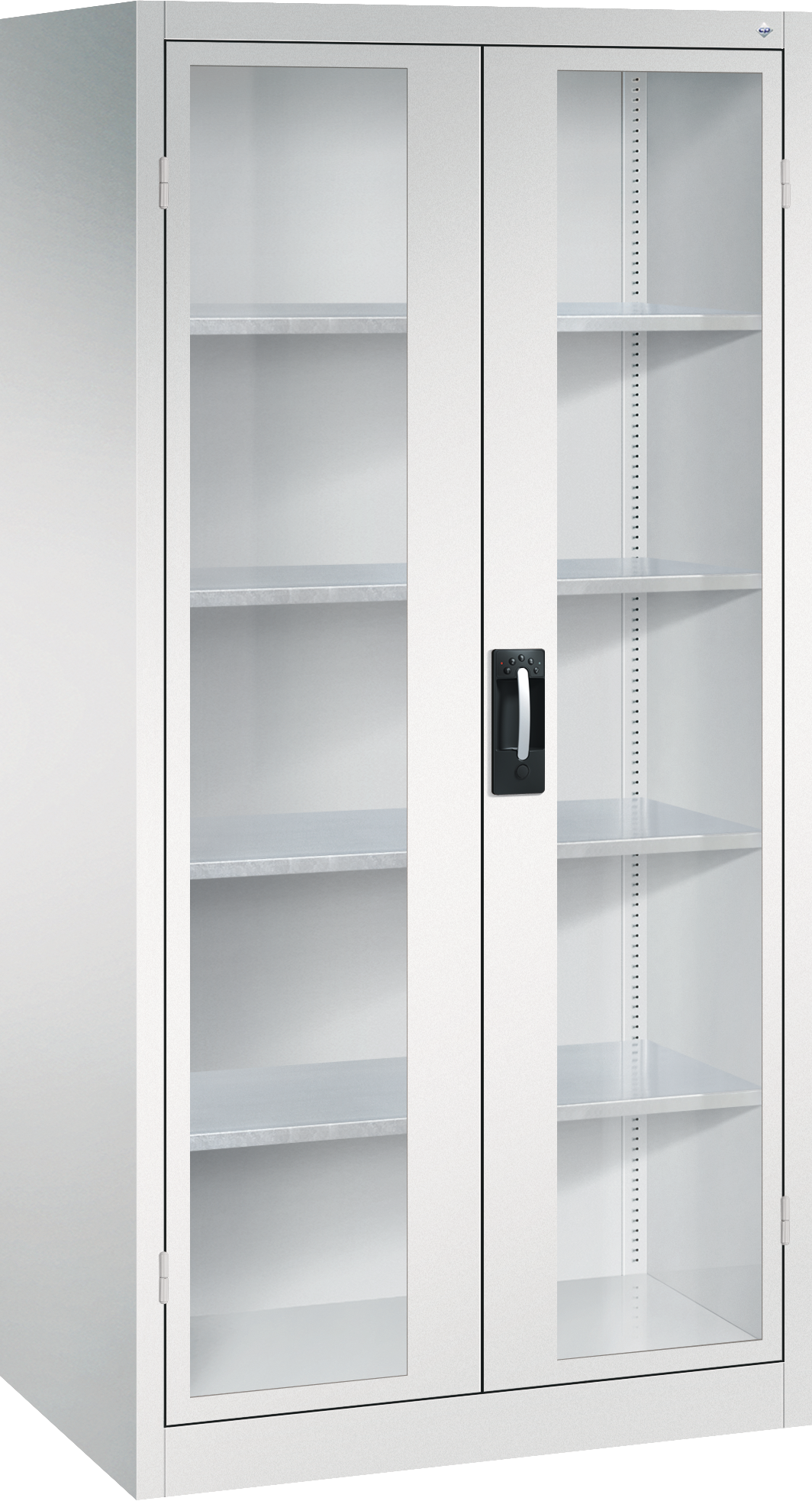 - langlebige, sauber verarbeitete Stahlblechkonstruktion - Türen in Drehbolzen gelagert mit 180° Öffnungswinkel - dreiriegeliges Griffschloss ERGO-LOCK 4.0 mit zwei Schlüsseln und patentiertem Mechanismus - Einlegeböden im Raster 15 mm höhenverstellbar - Einbrennbeschichtung in RAL 7035 lichtgrau - Sichtfenster aus Acrylglas 3 mm