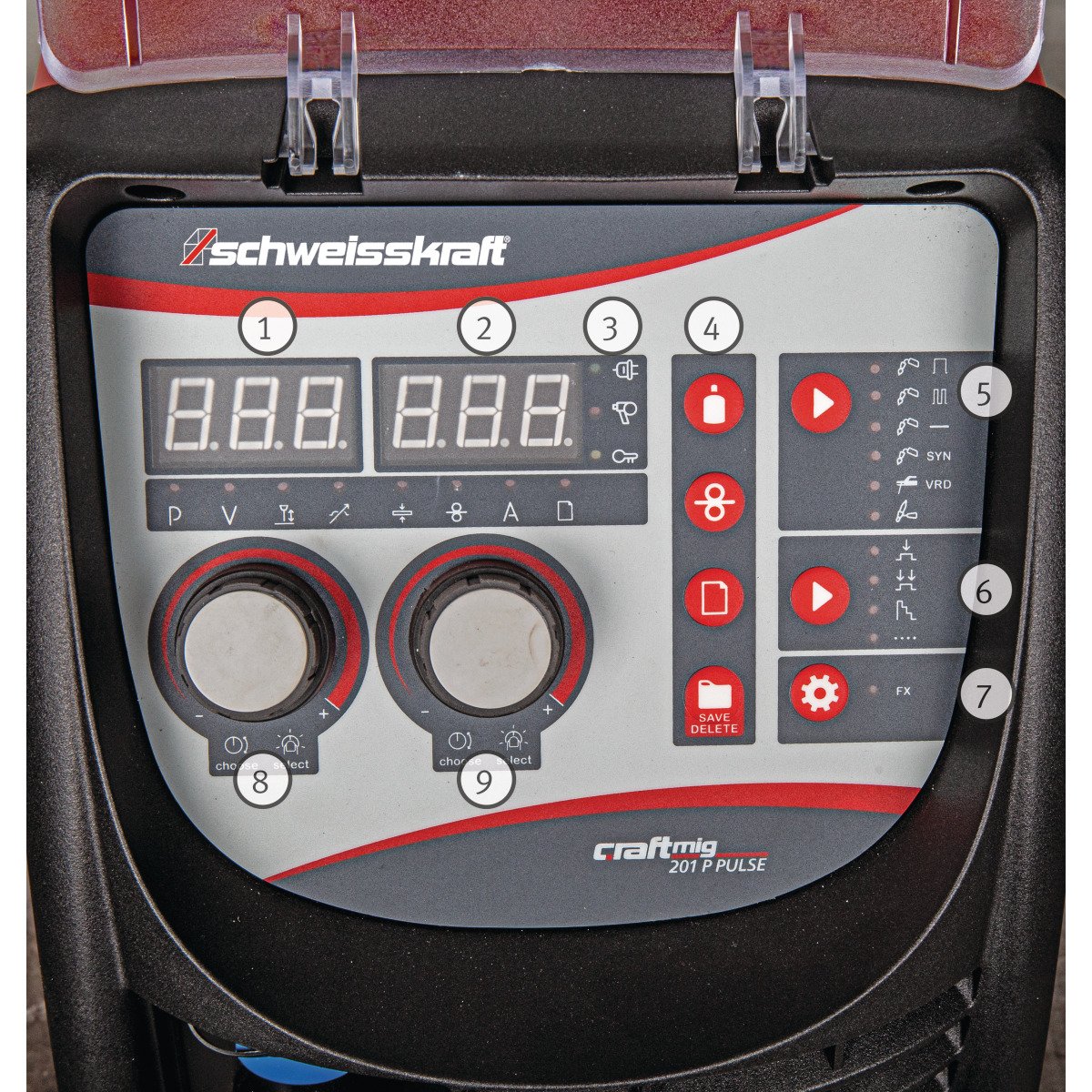 - Genaue Einstellung der Schweißparameter über digitales Display mit Jobspeicher