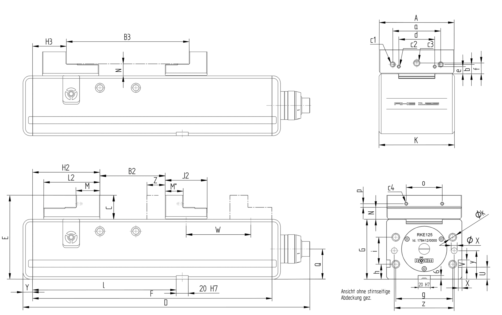 stabiler Stahlgrundkörper, Führungen allseitig gehärtet und geschliffen, langer Spannschieber mit Quernuten, allseitig gehärtet, Funktionsflächen geschliffen, Antriebsspindel mit Spannkraftvoreinstellung, Spannpratzen in vorgesehenen Spannflächen einsetzbar, mit zentralem Schmiernippel zur einfachen Schmierung von Führungen und Spindelgewinde, stabiler Späneschutz verhindert das Eindringen von Spänen in den Innenraum des Körpers, Gewindebohrungen zur Aufnahme aller Röhm-Flachspannbacken, Gewinde für Winkeltriebbefestigung