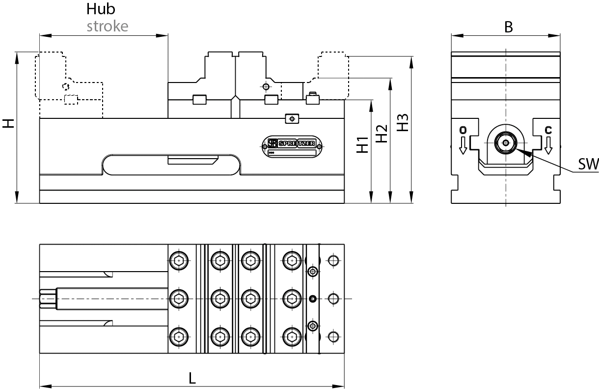 | Position | Code | Spannbereich (mm) | Backenbreite (mm) | Spannkraft (kN) | H2 (mm) | Typ | SW (mm) | H (mm) | L (mm) | H1 (mm) | H3 (mm) | Anzahl | VE | Preis/VE | |||