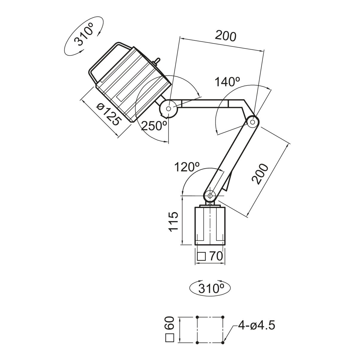 - Anbau mittels Halter am Fuß, Drehbar 310°