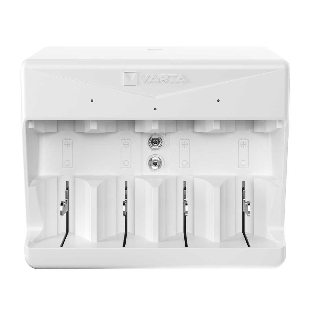 lädt wahlweise 2 oder 4 Akkus der Größen AA, AAA, C oder D sowie eine 9V-Zelle, grüne LEDs für Ladeanzeige