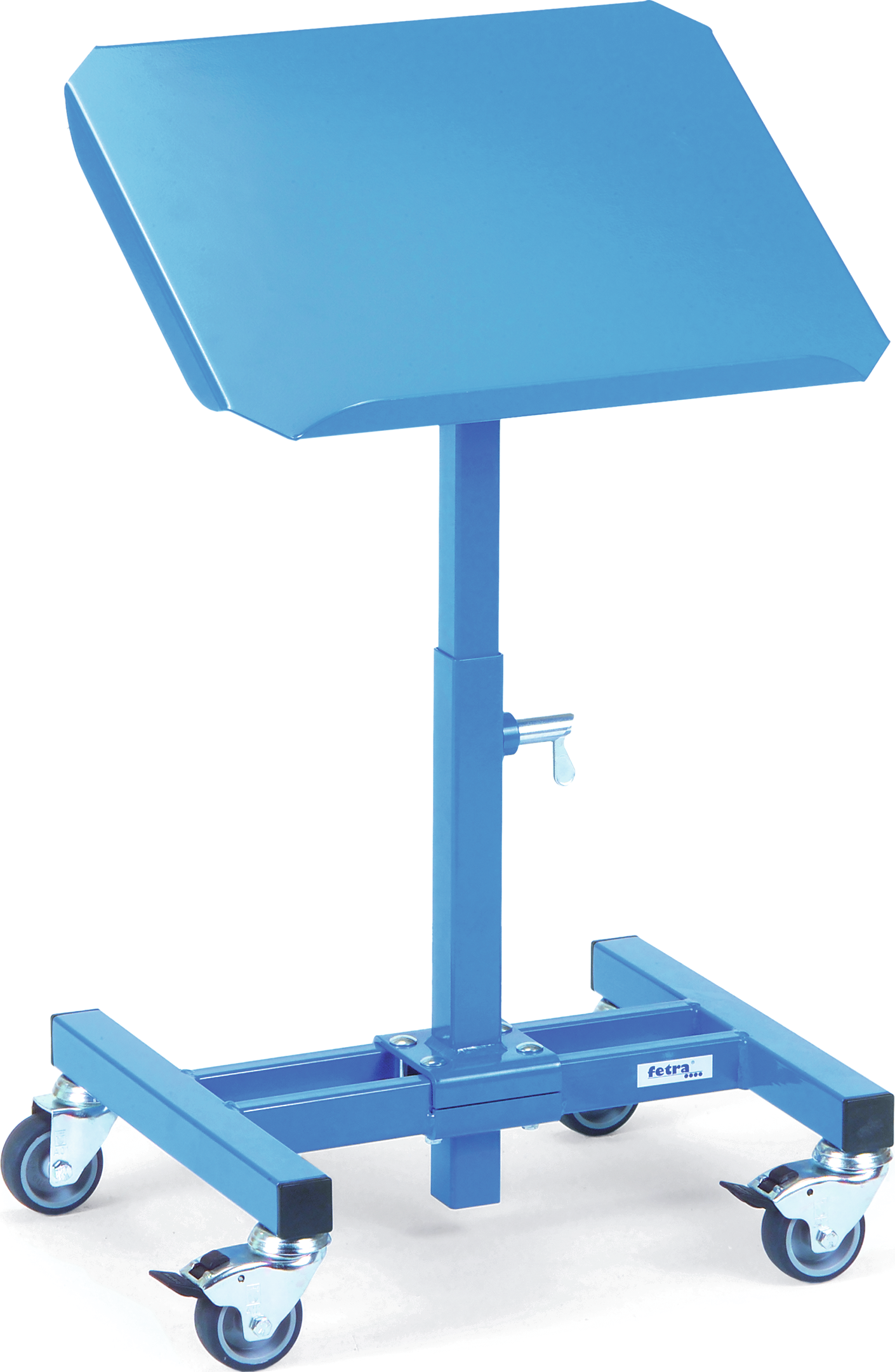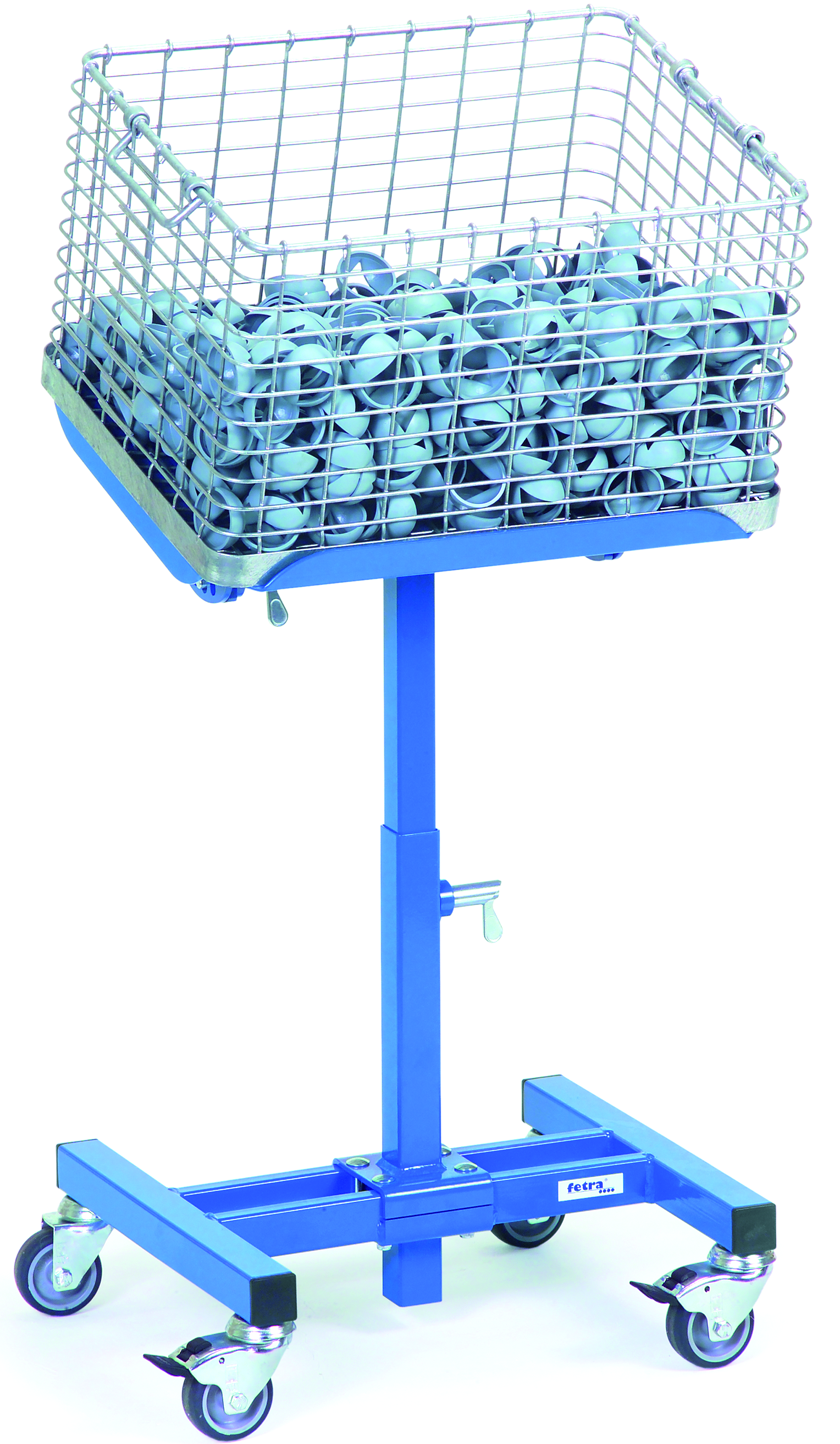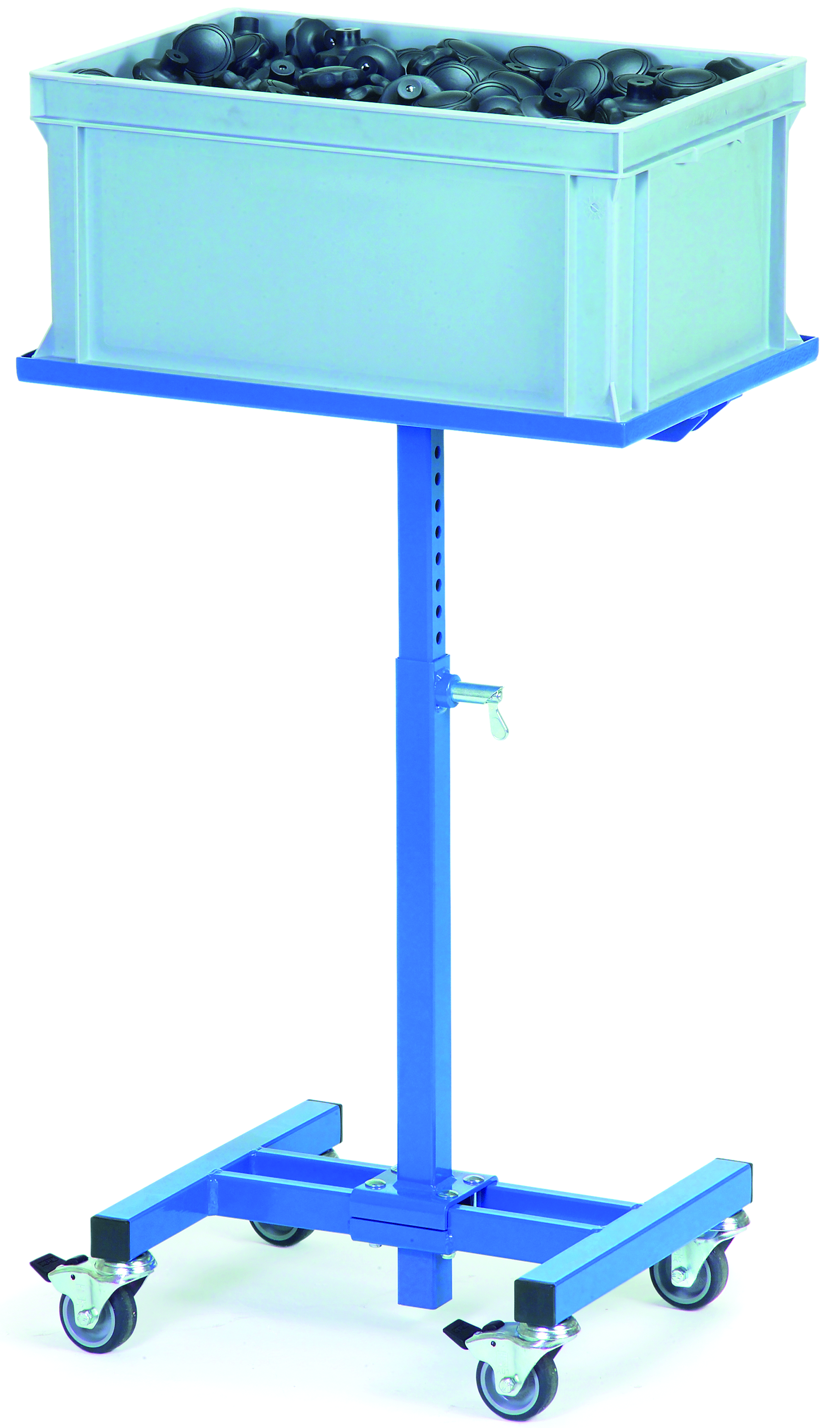 Profilstahl/Rohrkonstruktion, kugelgestrahlt und pulverbeschichtet, 4 Lenkrollen, davon 2 mit Feststeller, Naben mit Gleitlager, Höhenverstellung im Raster von 25 mm