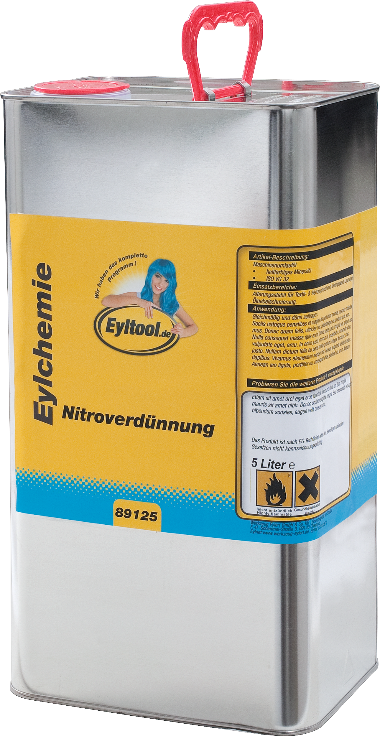 | Einsatz: | verdünnt verschiedene Lacke, reinigt Lackierpistolen, Pinsel usw., entfernt Öle, Fette, Teer und Kleberreste |