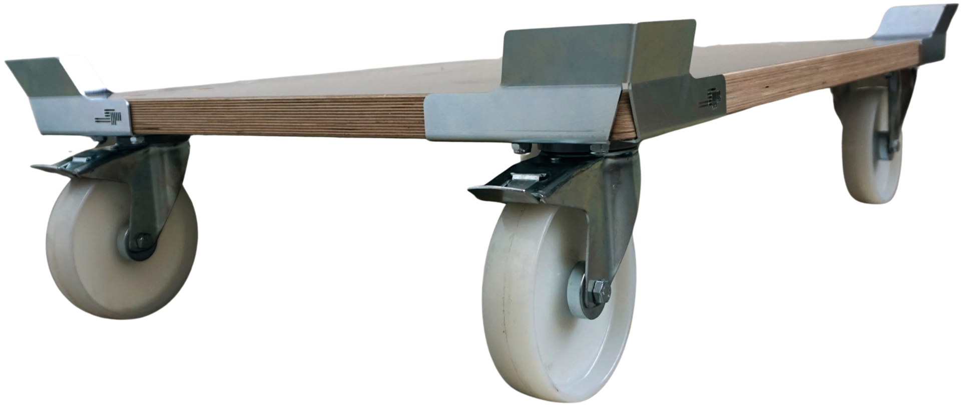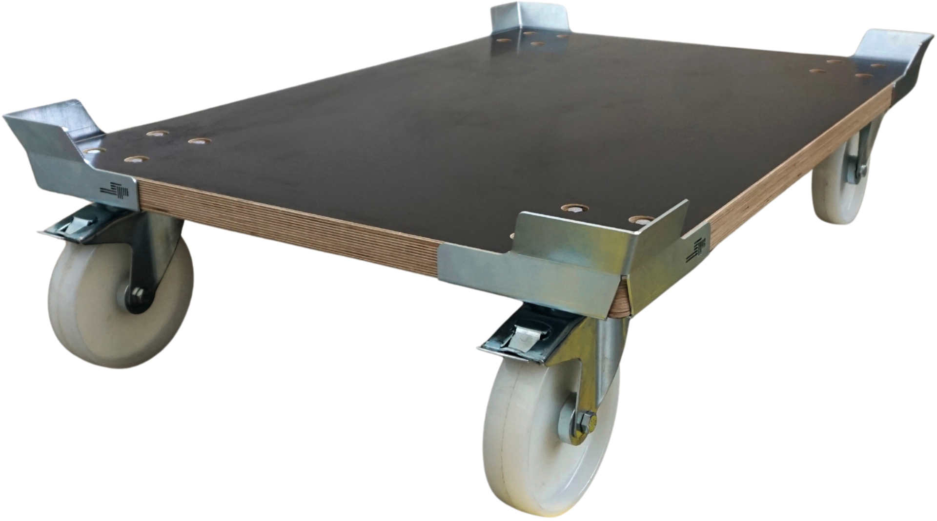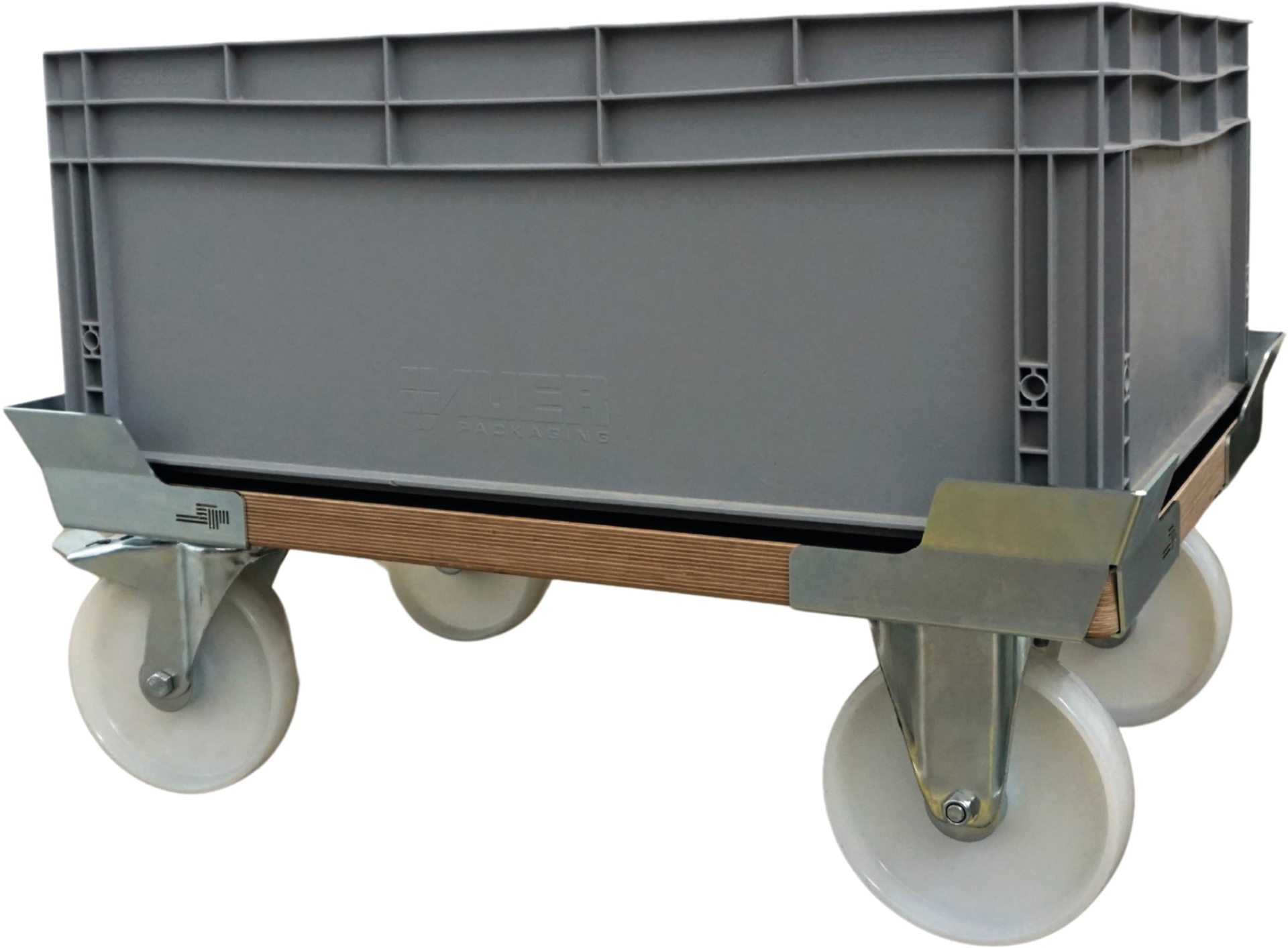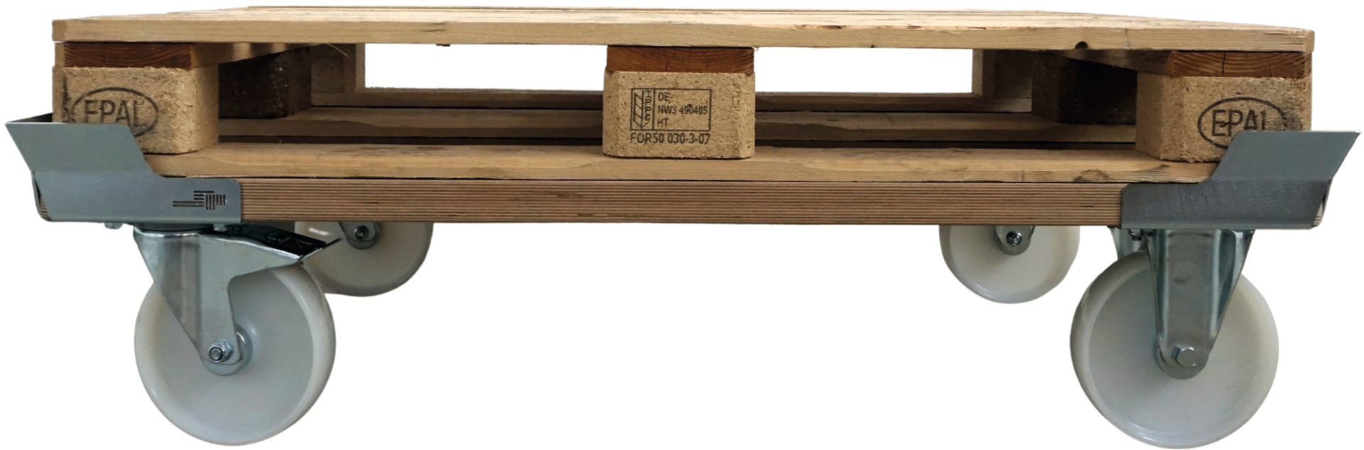 stabile Konstruktion aus WVC-Platten (Holzfurnierlagerverbundstoff), nachhaltige Bauweise mit CO²-Bindung, 2 Lenk- und 2 Bockrollen, mit 4 Fangecken