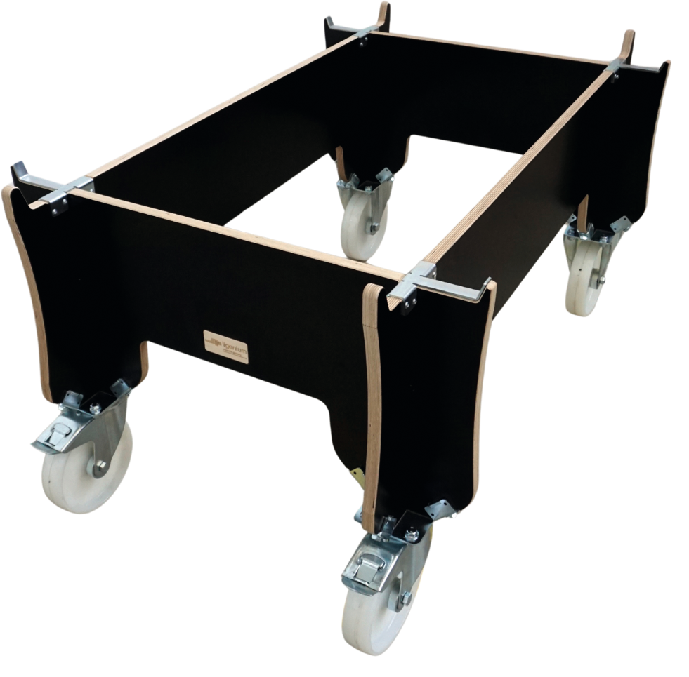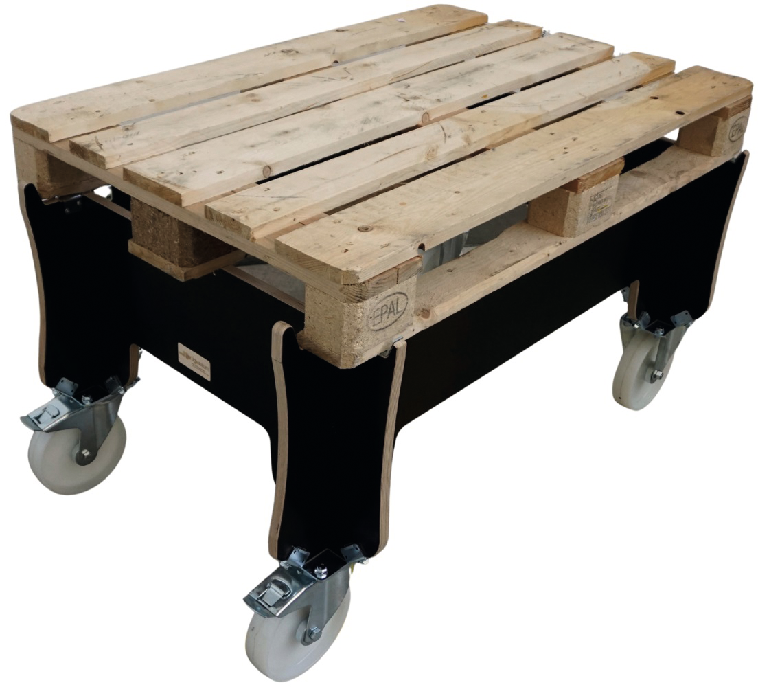 stabile Konstruktion aus WVC-Platten (Holzfurnierlagerverbundstoff), nachhaltige Bauweise mit CO²-Bindung, 2 Lenk- und 2 Bockrollen, mit 4 Fangecken, mit erhöhter Ladefläche für ergonomisches Arbeiten