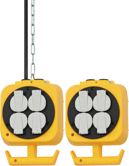 8 Schutzkontakt-Steckdosen mit selbstschließenden Deckeln, Gehäuse mit großem Werkzeughaken, verzinkte Stahl-Gliederkette 3 m