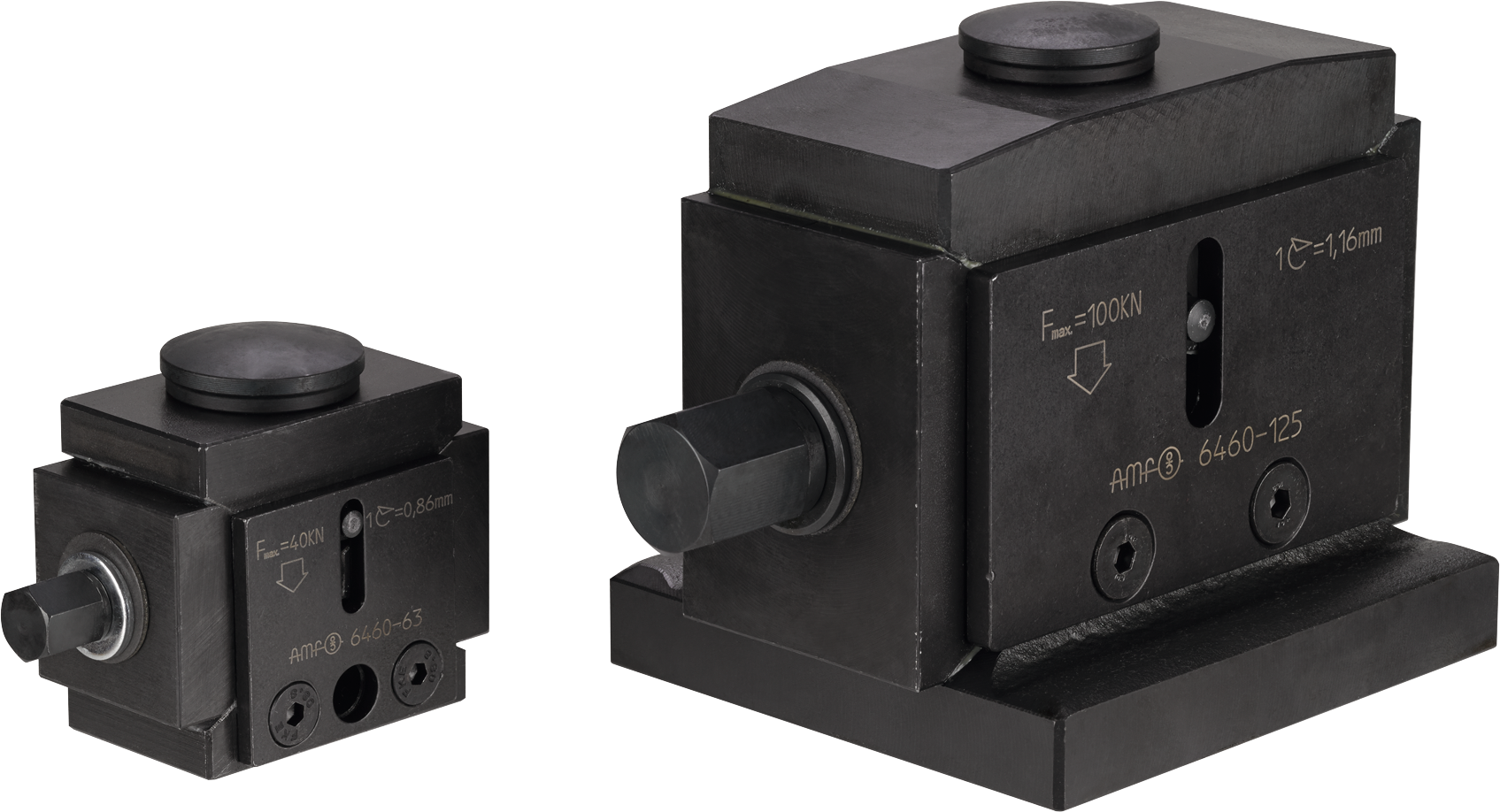 | Einsatz: | mit üblicher Handkraft lässt sich der Richtkeil noch bei einer Belastung von 1/3 Fmax. leicht verstellen, die fein bearbeitenden Keilflächen erlauben ein ruhiges, feinfühliges Verstellen, genauer als 1/10 mm, wahlweise durch Rändelschraube oder mit S |