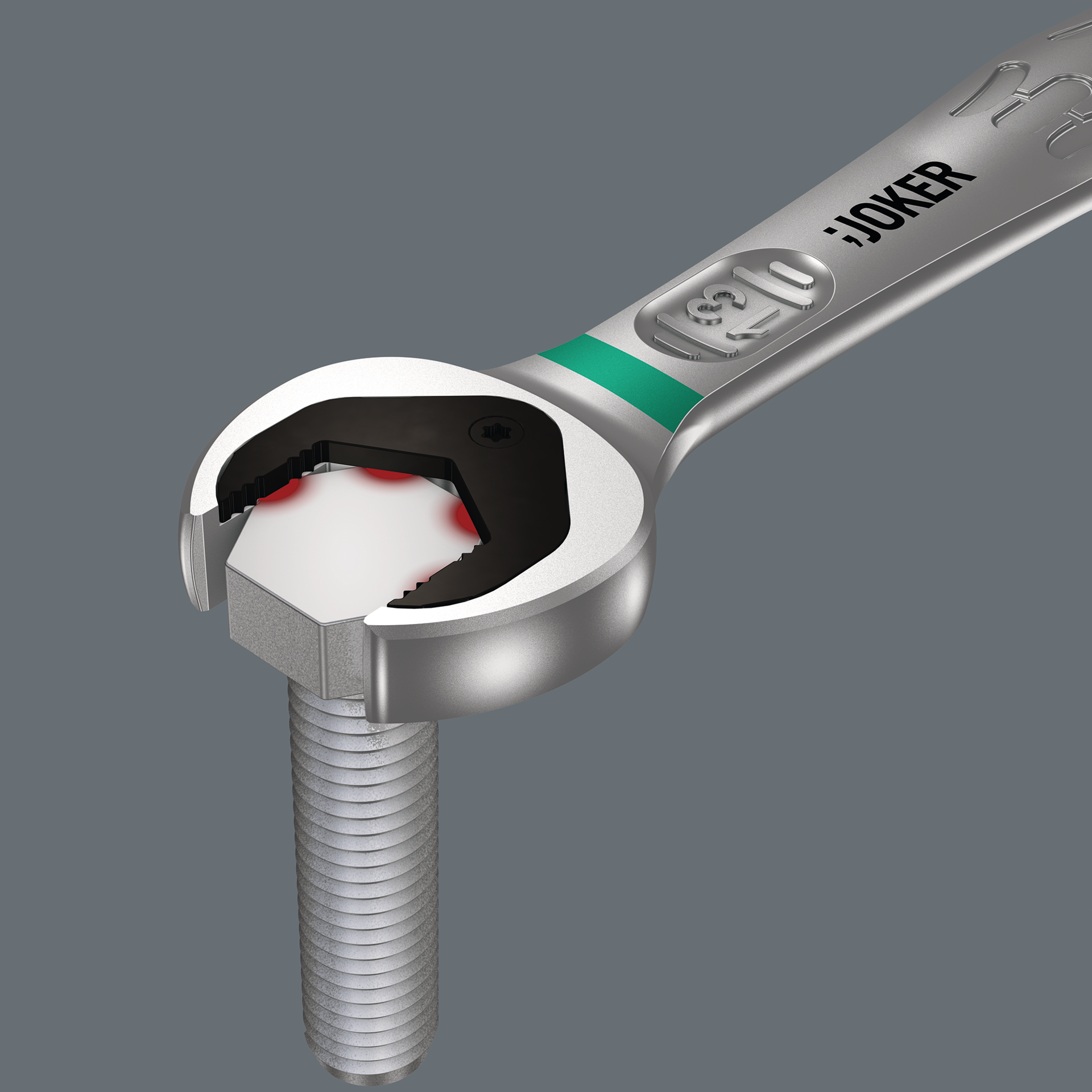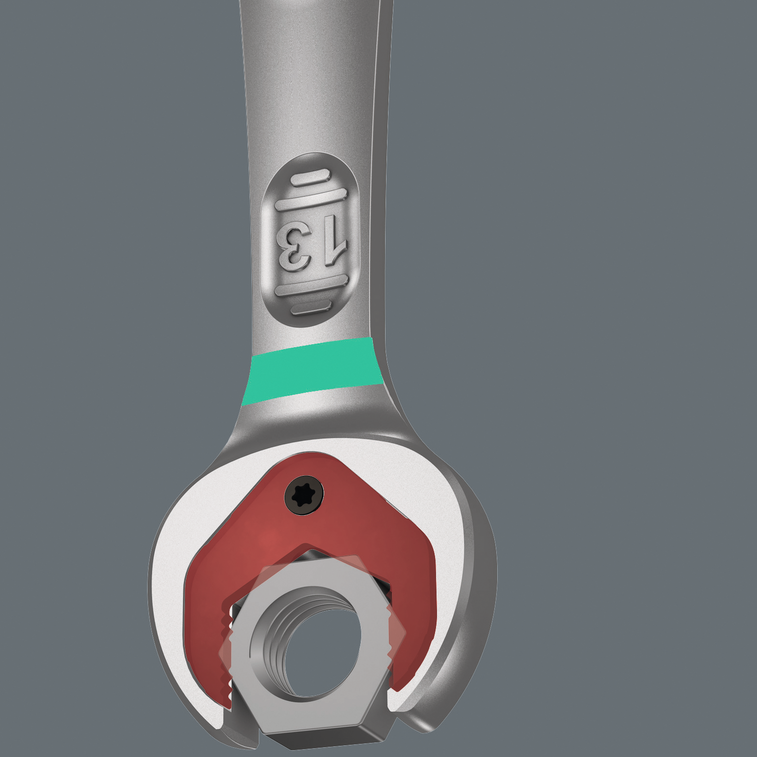 Maulseite mit neuartiger Haltefunktion, Herunterfallen der Schraube oder Mutter kann dadurch effektiv vermieden werden, durch Endanschlag wird die Abrutschgefahr vom Schraubenkopf nach unten verringert, Verletzungsgefahr wird dadurch minimiert, Maulseite mit sehr kleinem Rückholwinkel von 30°~Ratschenkopf 15° abgewinkelt, mit Umschalthebel