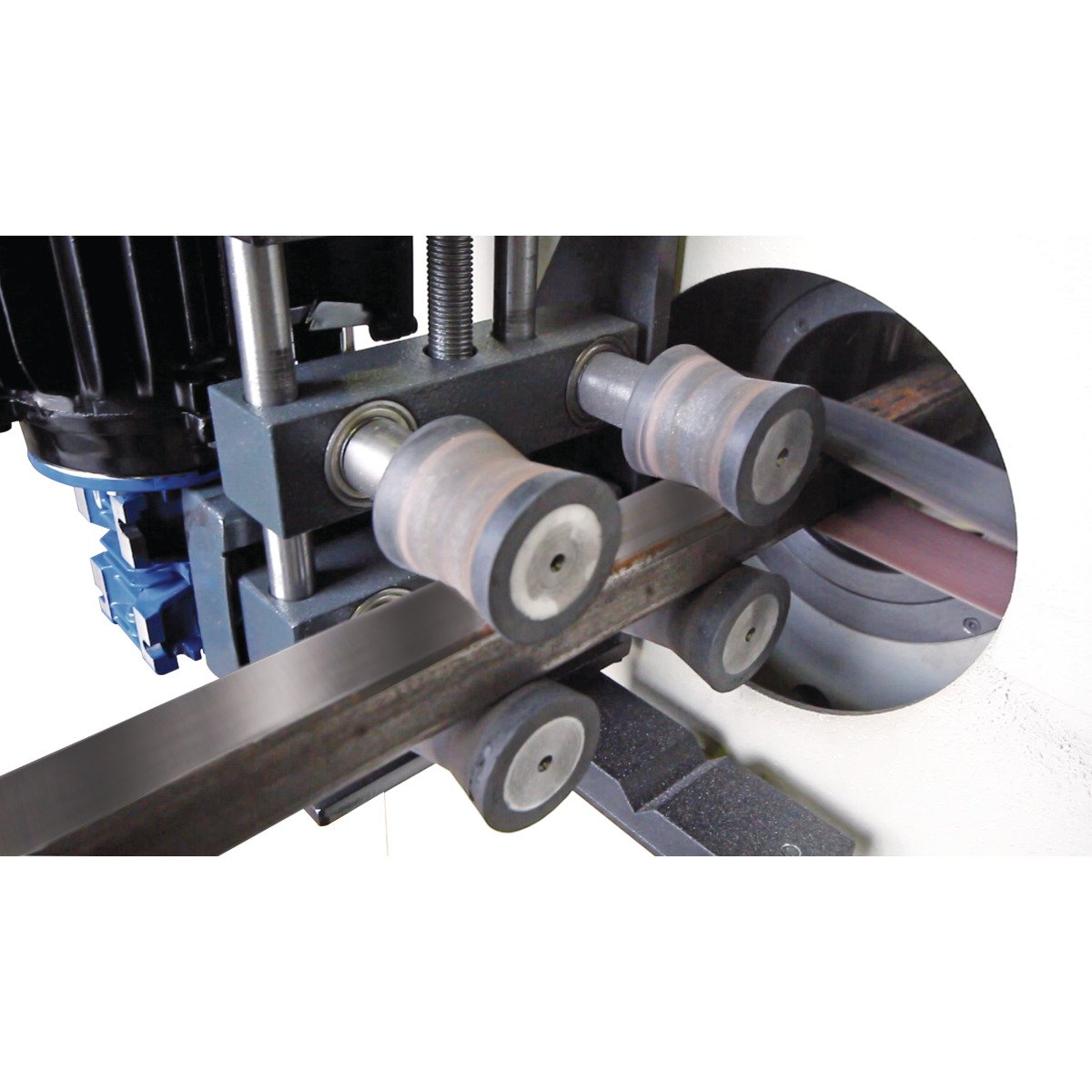 - Vorschubeinheit mit Kautschukrollen sorgt für die sichere Beförderung des Werkstücks