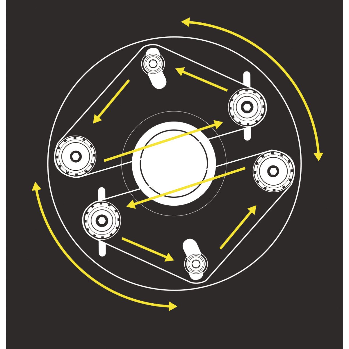 - Zwei entgegengesetzt laufende Schleifbänder auf rotierendem Kopf, das Verdrehen des Werkstücks entfällt