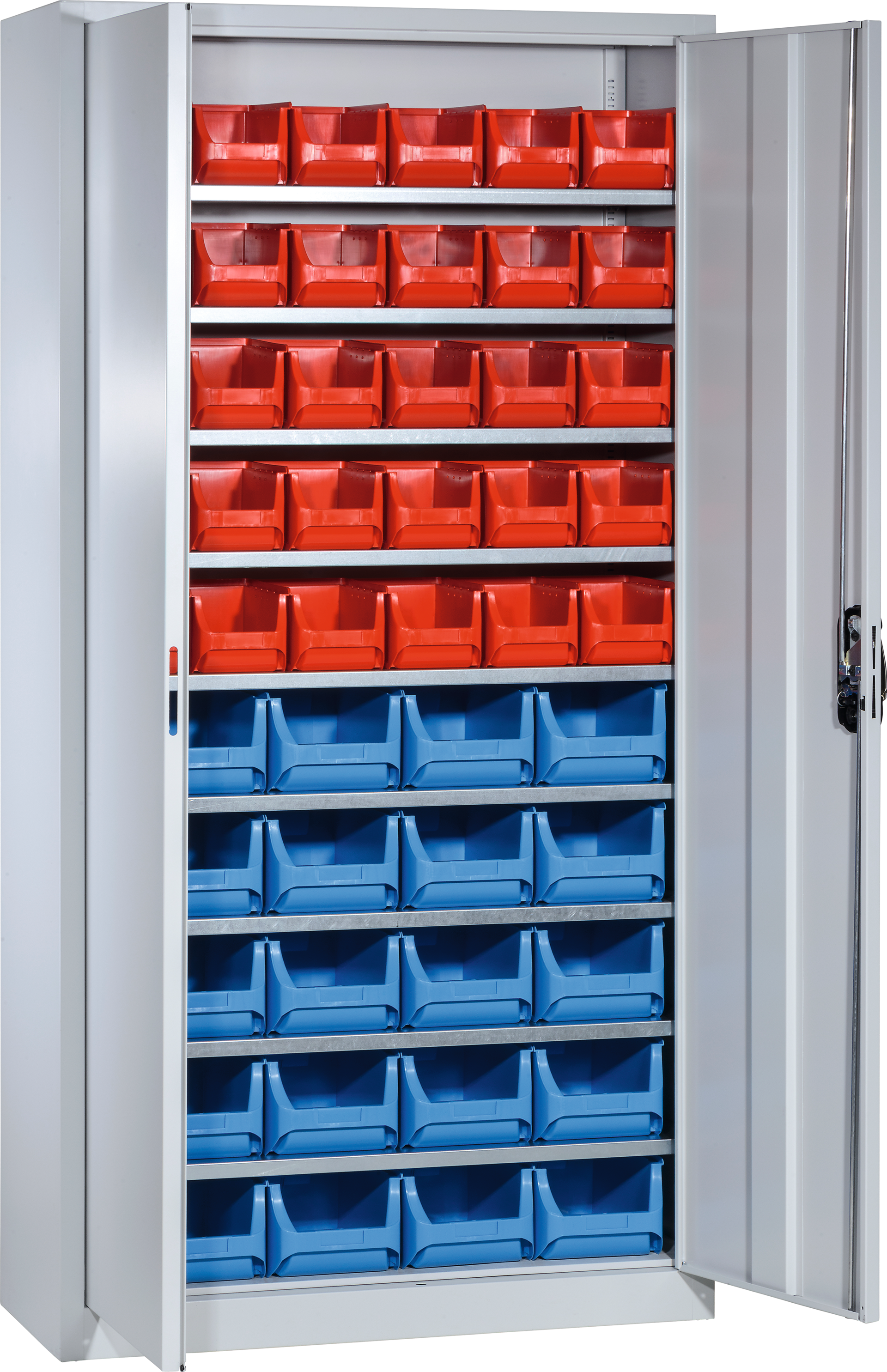 - langlebige und sauber verarbeitete Stahlblechkonstruktion - dreiriegeliges Griffschloss ERGO-LOCK 4.0 mit zwei Schlüsseln und patentiertem Mechanismus - mit Flügeltüren, in Drehbolzen gelagert mit Türöffnungswinkel 110° - Einlegeböden höhenverstellbar im Raster 10 mm, - Einbrennbeschichtung in RAL 7035 lichtgrau