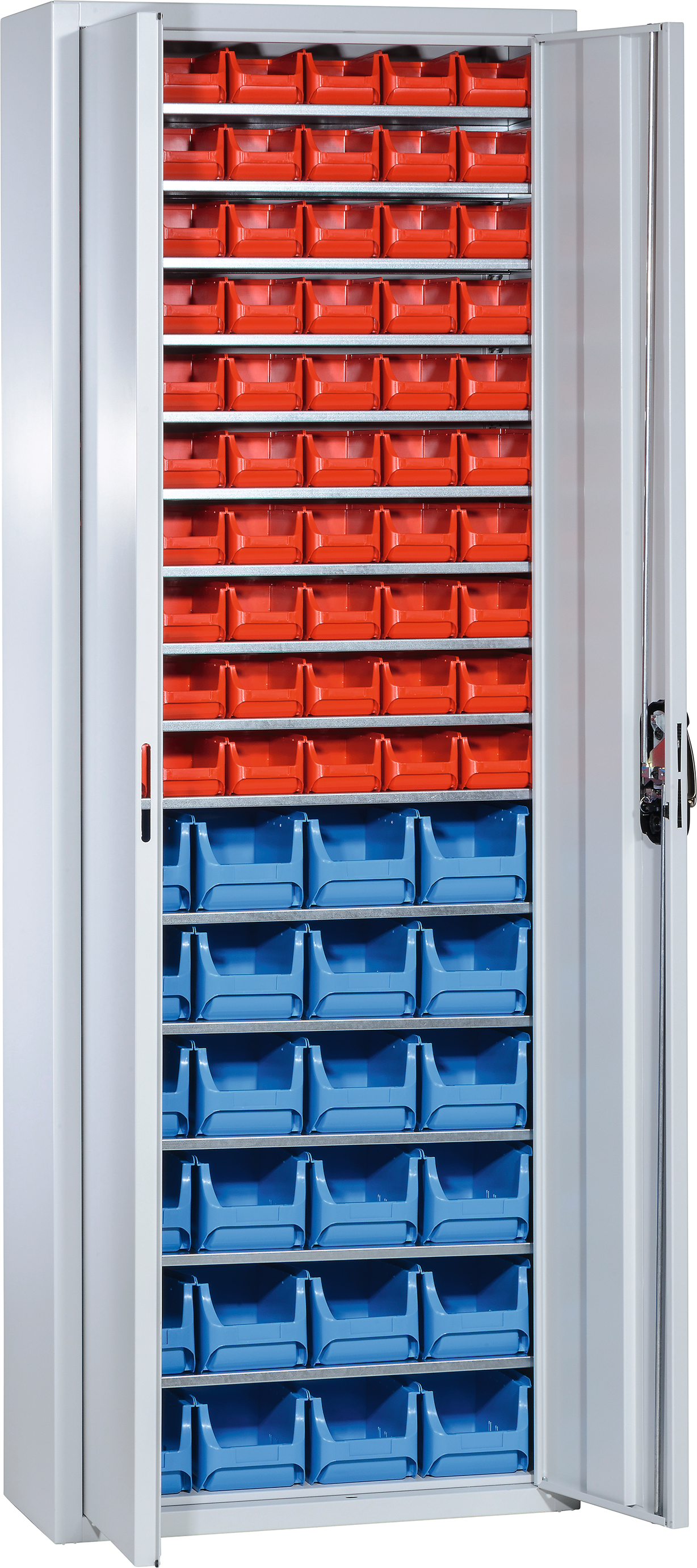 Schrank Lagersichtboxen RAL7035 LS1000 H1980 x B1000 x T420mm 9 Böden/40 Kästen
