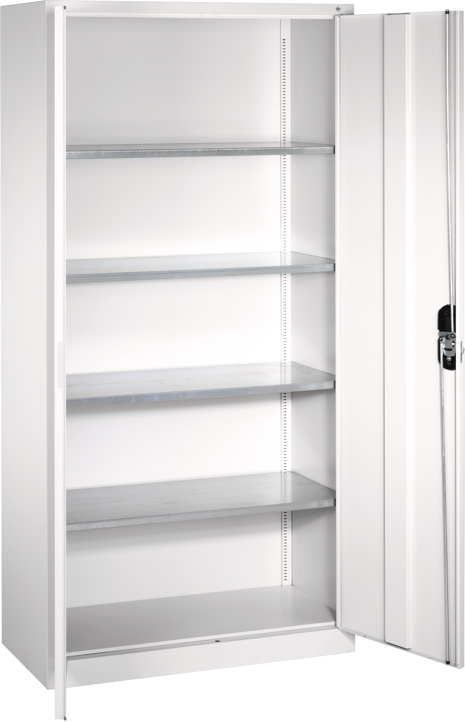 - langlebige und sauber verarbeitete Stahlblechkonstruktion - dreiriegeliges Griffschloss ERGO-LOCK 4.0 mit zwei Schlüsseln und patentiertem Mechanismus - mit Flügeltüren, in Drehbolzen gelagert mit Türöffnungswinkel 110° - Einlegeböden höhenverstellbar im Raster 10 mm, - Einbrennbeschichtung in RAL 7035 lichtgrau
