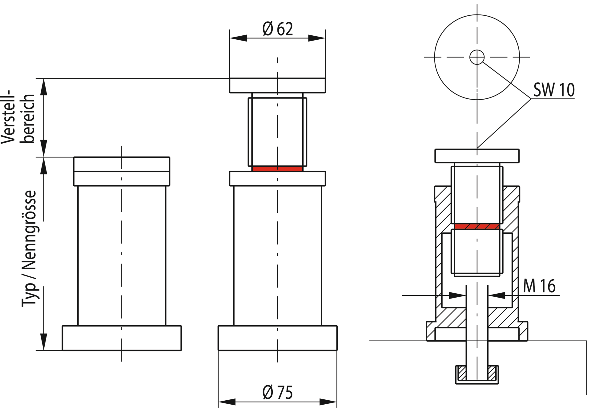 Spindel aus Maschinenbaustahl, verzinkt und chromatiert, Körper aus Präzisionsstahlrohr, blau beschichtet, Höhe schnell voreinstellbar mit Innensechskant-Schlüssel und regulierbar durch metrisches Feingewinde, selbsthemmend, übereinander angeordnet anwendbar, Gewinde M16 im Fußteil