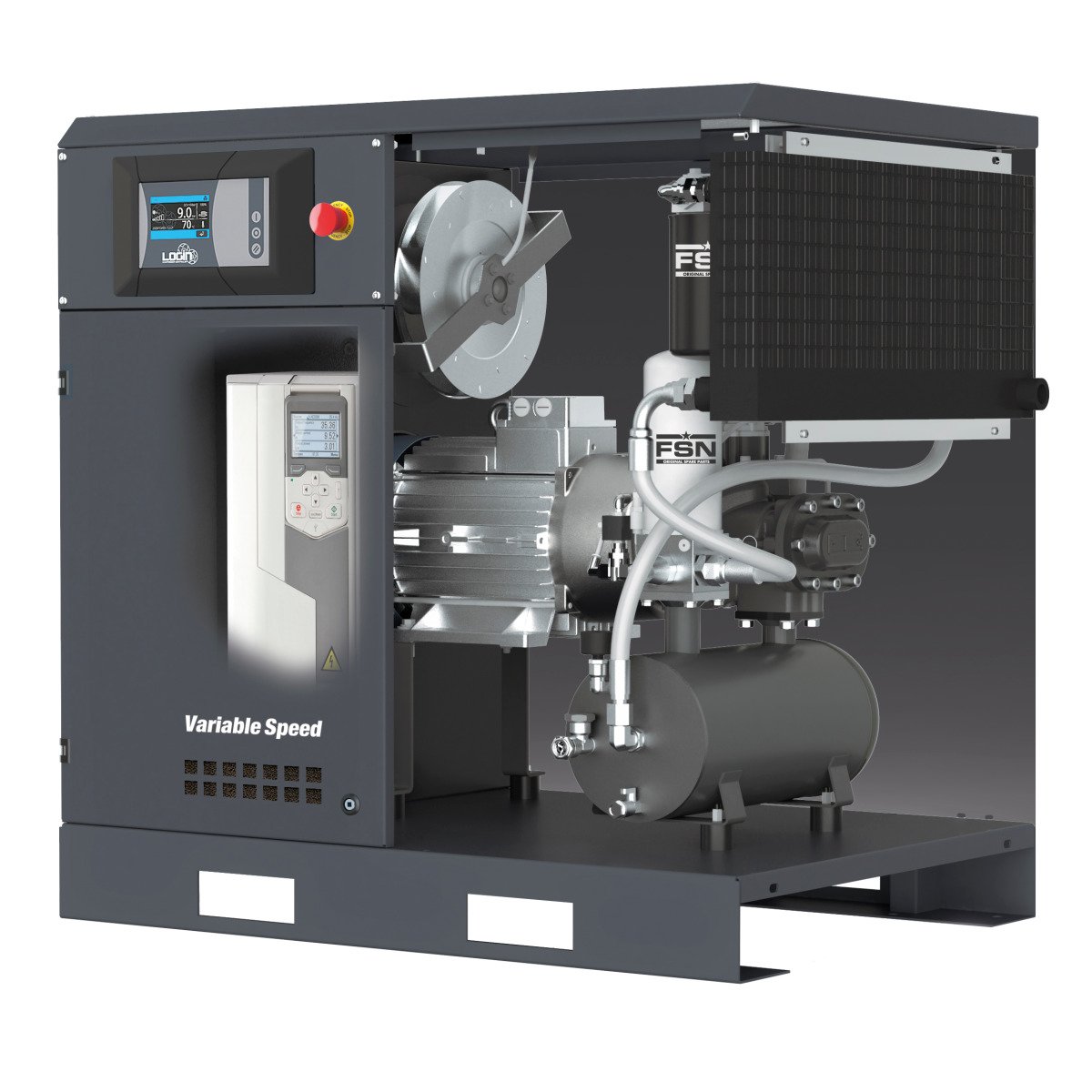 Kompakter Schraubenkompressor mit variabler Drehzahlregelung durch IE4 Permanentmagnetmotor und innovativer LOGIN-Steuerung