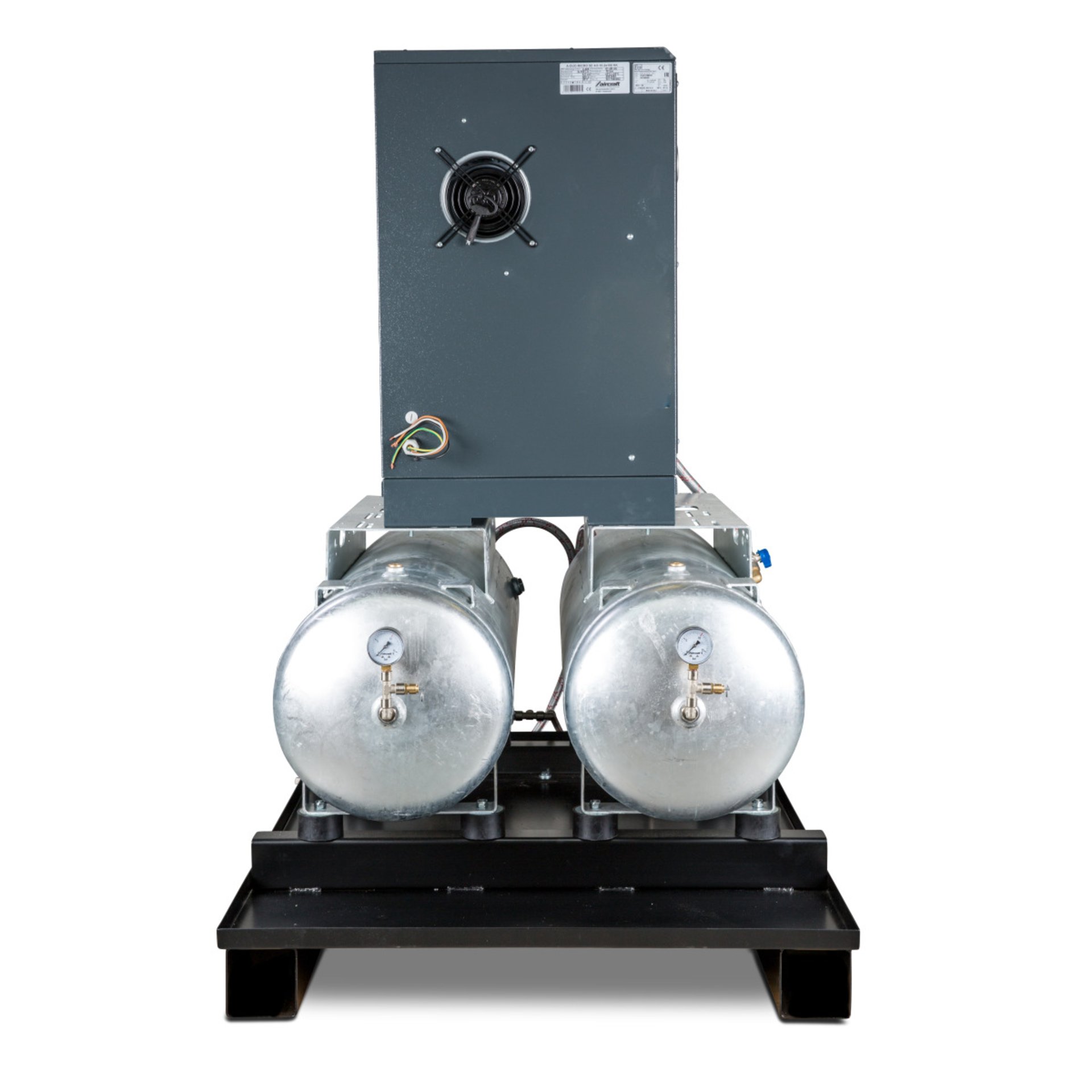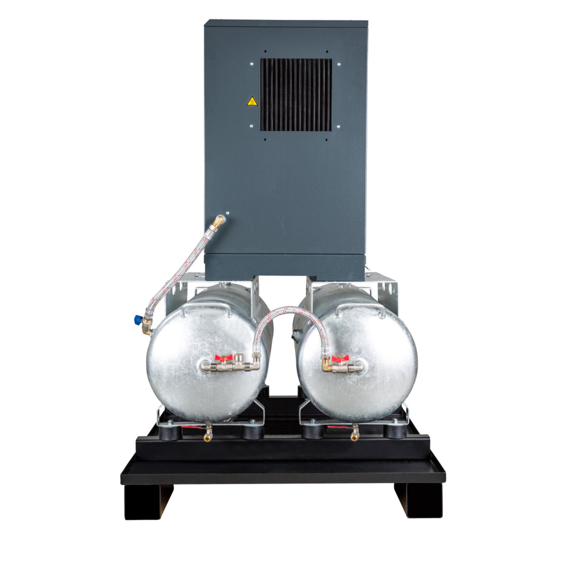 4 kW Schraubenkompressor mit Rippenbandriemenantrieb auf 2 x 100 l Kesseln auf Sicherheits-Standpalette
