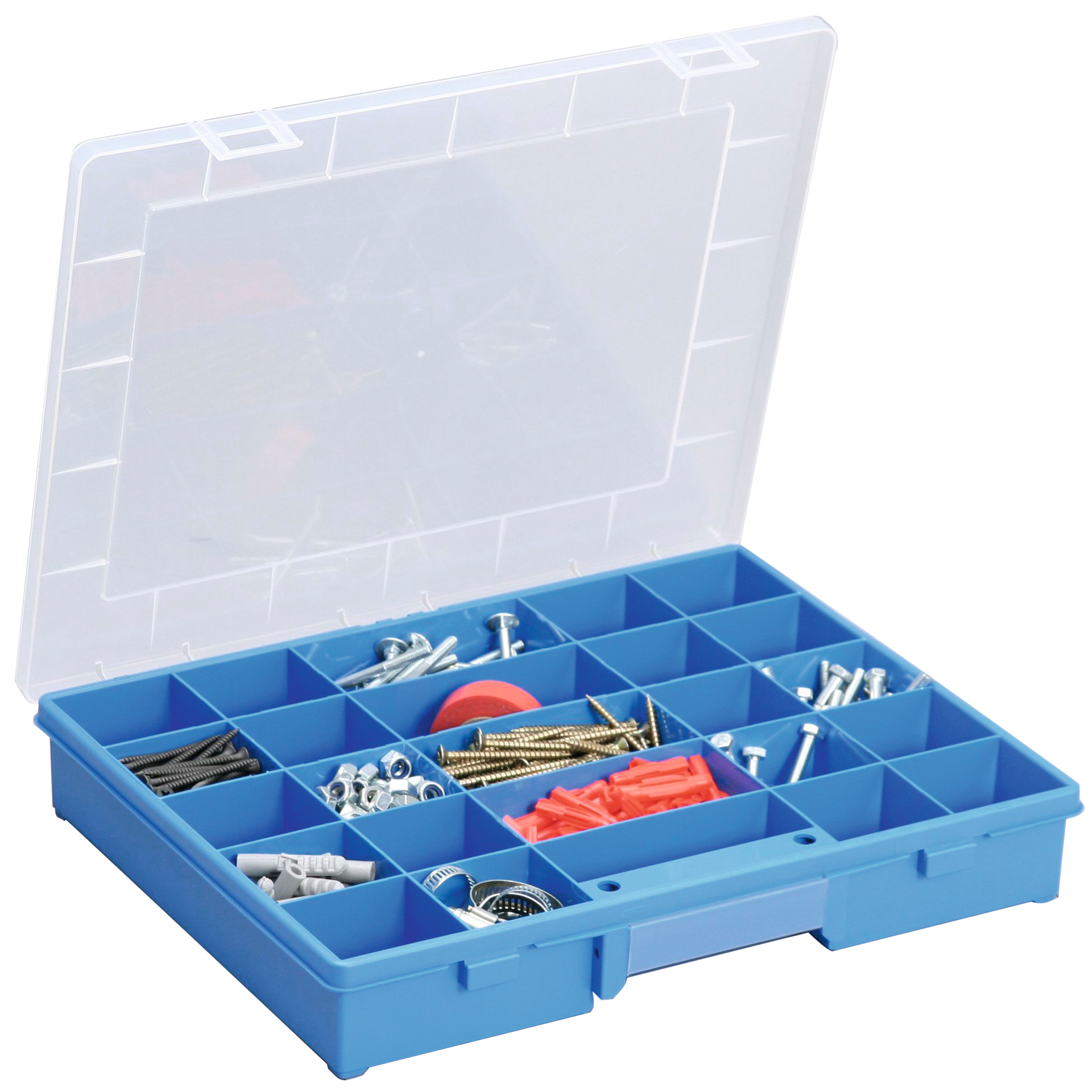 Sortimentskästen BASIC sind mit fester Einteilung, mit farbigem Unterteil, transparentem Deckel, Fächer schließen fest mit Deckel ab, die Griffmulde ist etikettierbar