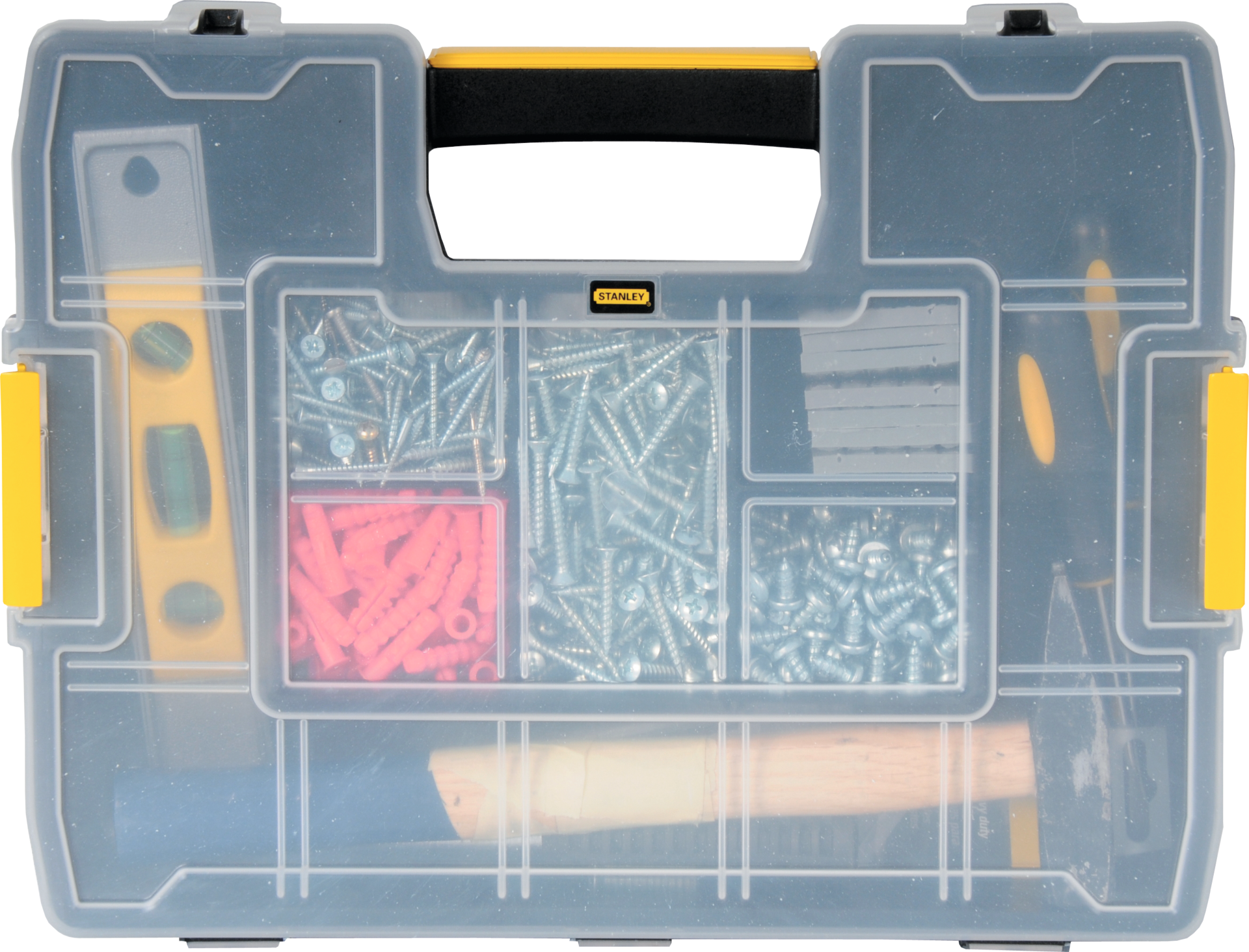 Innenteiler beliebig anpassbar, bis zu 512 verschiedene Konfigurationen möglich, angewinkelte Ecken für eine komfortable Aufbewahrung von sperrigen Werkzeugen wie Hämmer, spezielle Deckelkonstruktion: obere Rippen verschließen sich mit Innenteilern, Deckel zusätzlich verriegelbar