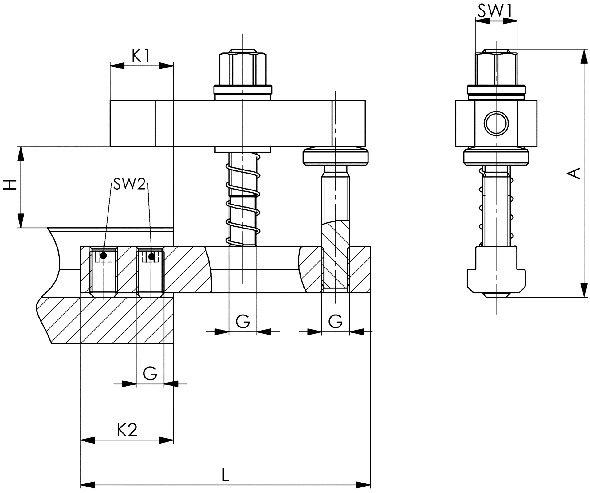 | Position | Code | G (mm) | L (mm) | Nut (mm) | K2 (mm) | H (mm) | A (mm) | Spannkraft (kN) | max- Drehmoment (Nm) | SW1 (mm) | K1 (mm) | SW2 (mm) | Anzahl | VE | Preis/VE | |||