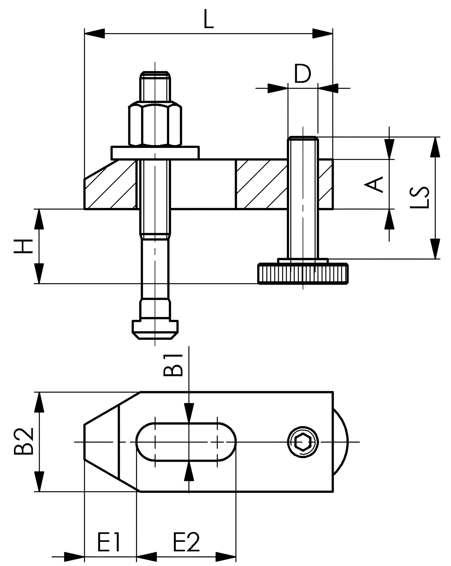 | Position | Code | B1 (mm) | Gewinde | E1 (mm) | D | B2 (mm) | Spannschraube (mm) | L (mm) | E2 (mm) | A (mm) | H (mm) | Nut (mm) | LS (mm) | Anzahl | VE | Preis/VE | |||