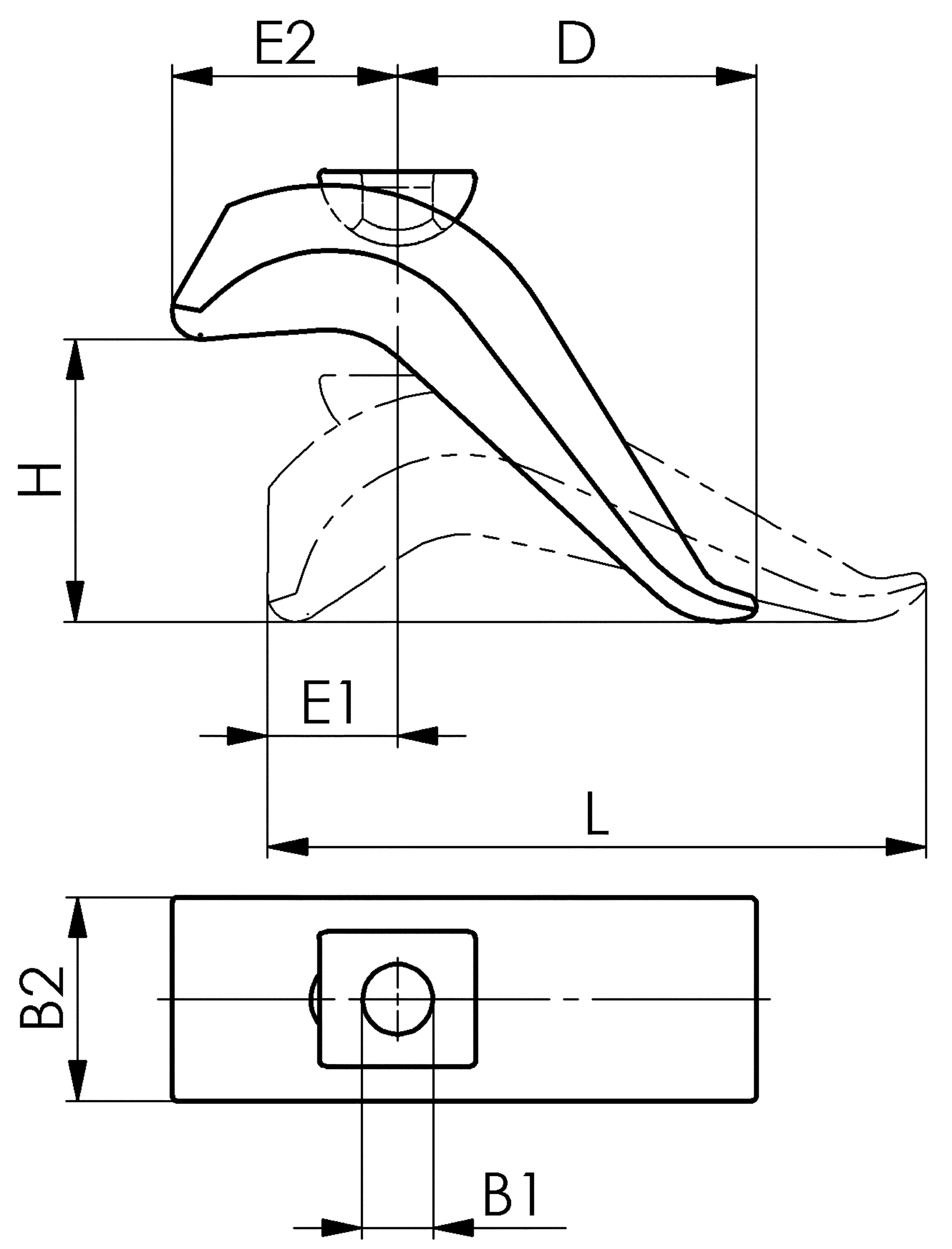 | Position | Code | H (mm) | L (mm) | B1 (mm) | B2 (mm) | D (mm) | E2 (mm) | Spannschraube (mm) | E1 (mm) | Nut (mm) | Anzahl | VE | Preis/VE | |||
