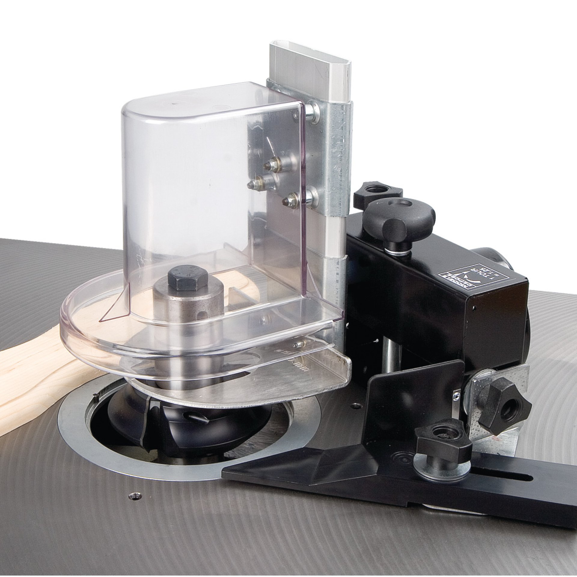 - Der Frässchutz ist für maximale Sicherheit serienmäßig mit einer höhenverstellbaren Führungsschiene und Schutzblech ausgestattet.