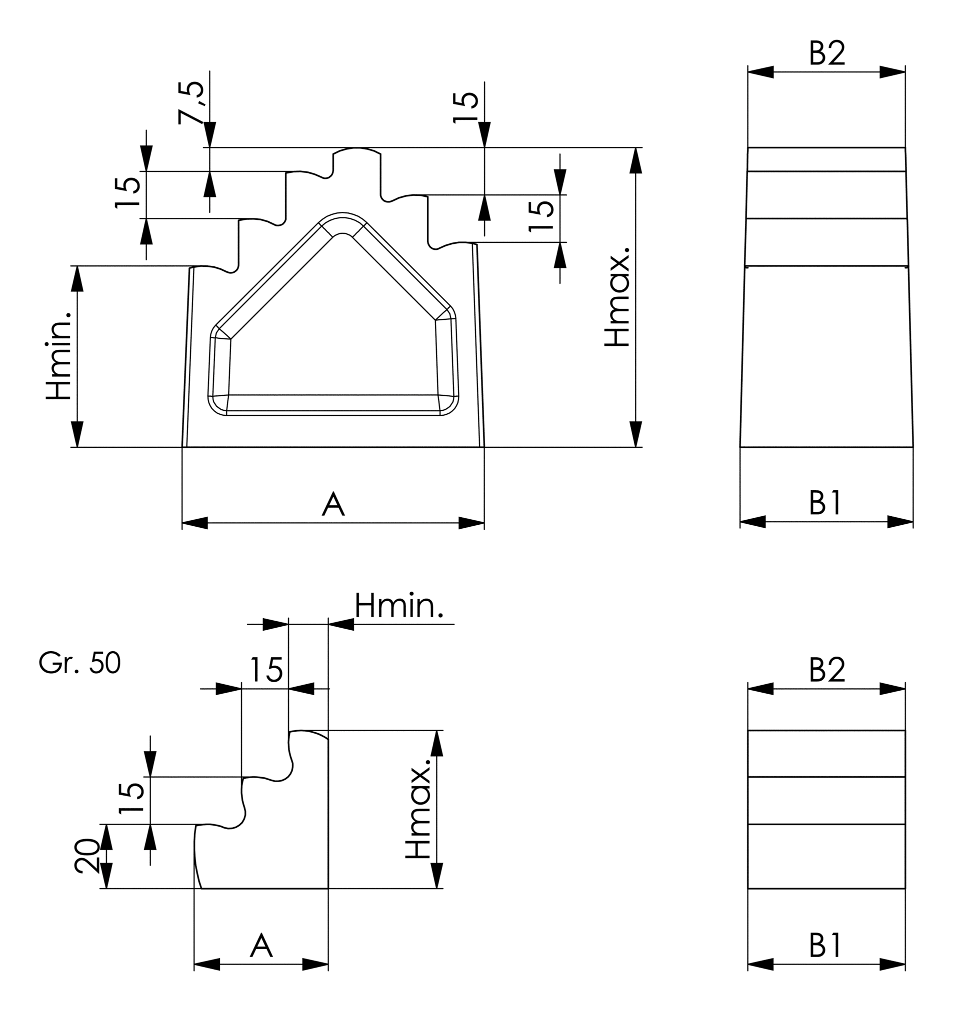 | Position | Code | B1 (mm) | B (mm) | Größe | L (mm) | H (mm) | Anzahl | VE | Preis/VE | |||