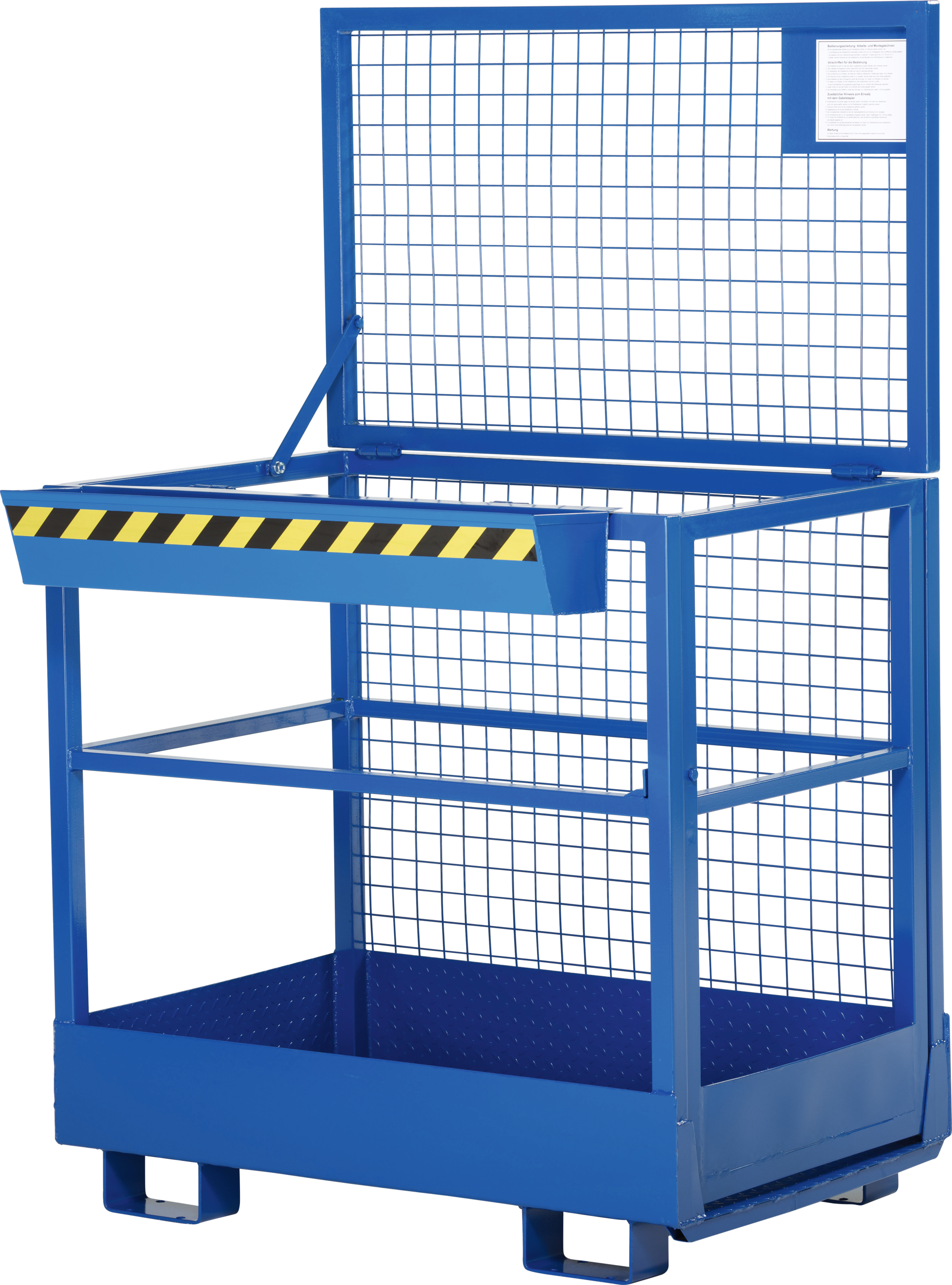 rutschsichere Arbeitsplattform mit Abrollschutz, Rückwand aus Drahtgitter, Steckbolzensicherung verhindert das Abrutschen von Zinken, Absturzsicherung aus Vierkantstahlrohr, gefertigt nach BGV 27.03, zulässig für zwei PersonenHinweis:Aus Sicherheitsgründen sind für diese Arbeitsbühnen Gabelstapler mit mindestens 1500 kg Tragfähigkeit zu verwenden!
