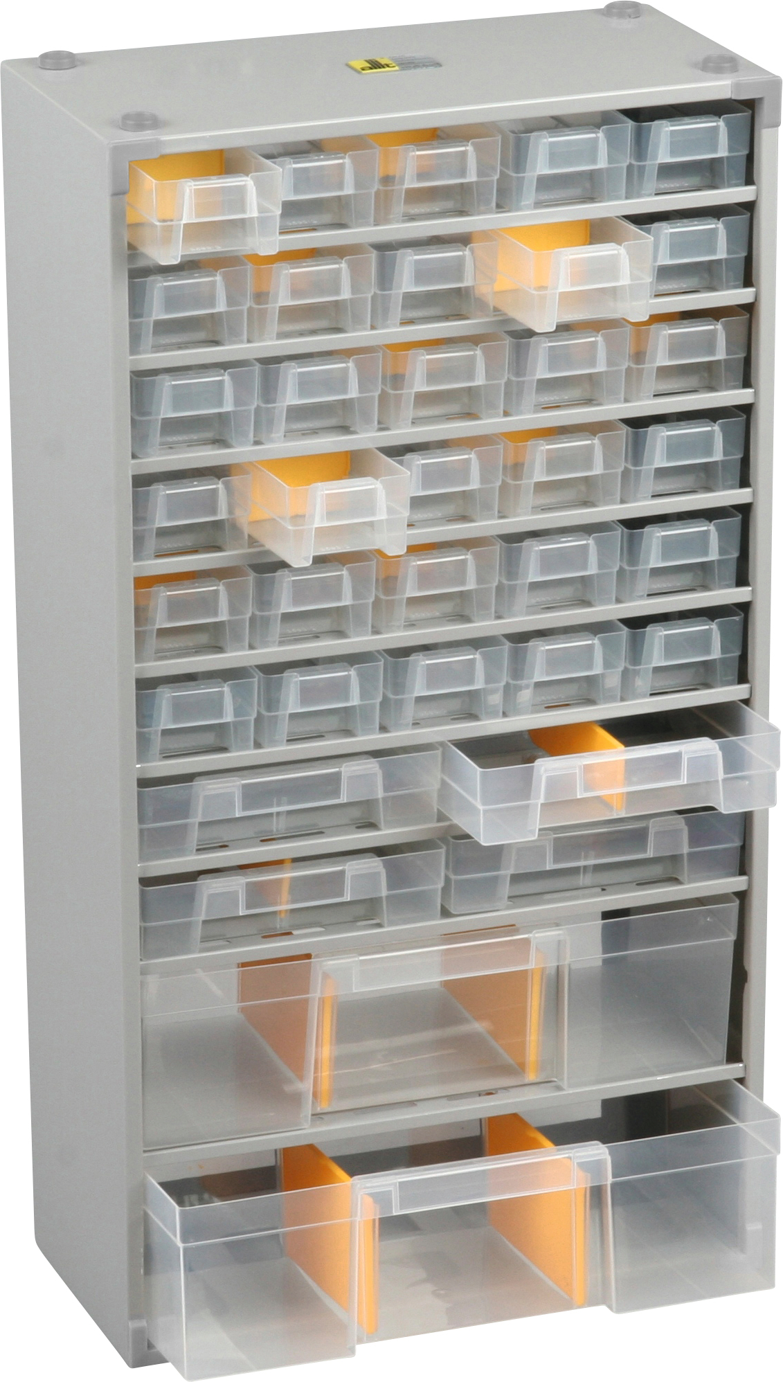 schwere Industriequalität zur Unterbringung von kleinen und größeren Teilen, mit Aufhängepunkten für Wandbefestigung oder Stapelung durch Sicken, Schubladen aus transparentem PolypropylenLieferumfang: