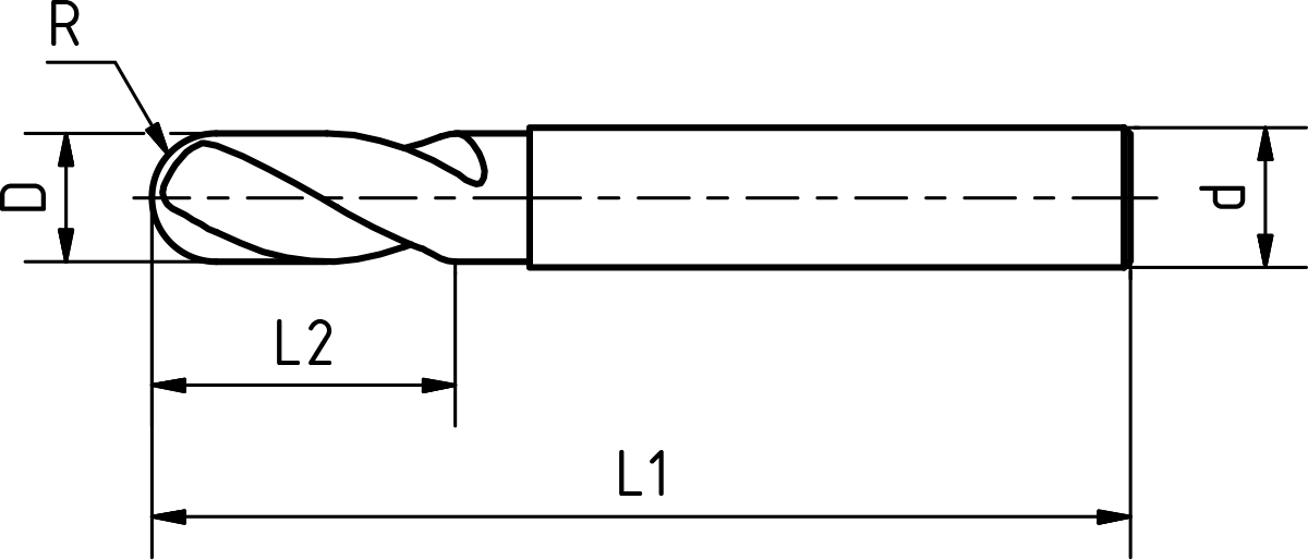 Vollradiuskopierfräser VHM Z2 Eyl+ Typ N DIN6527L/6535-HA lang R0,25mm D0,5mm