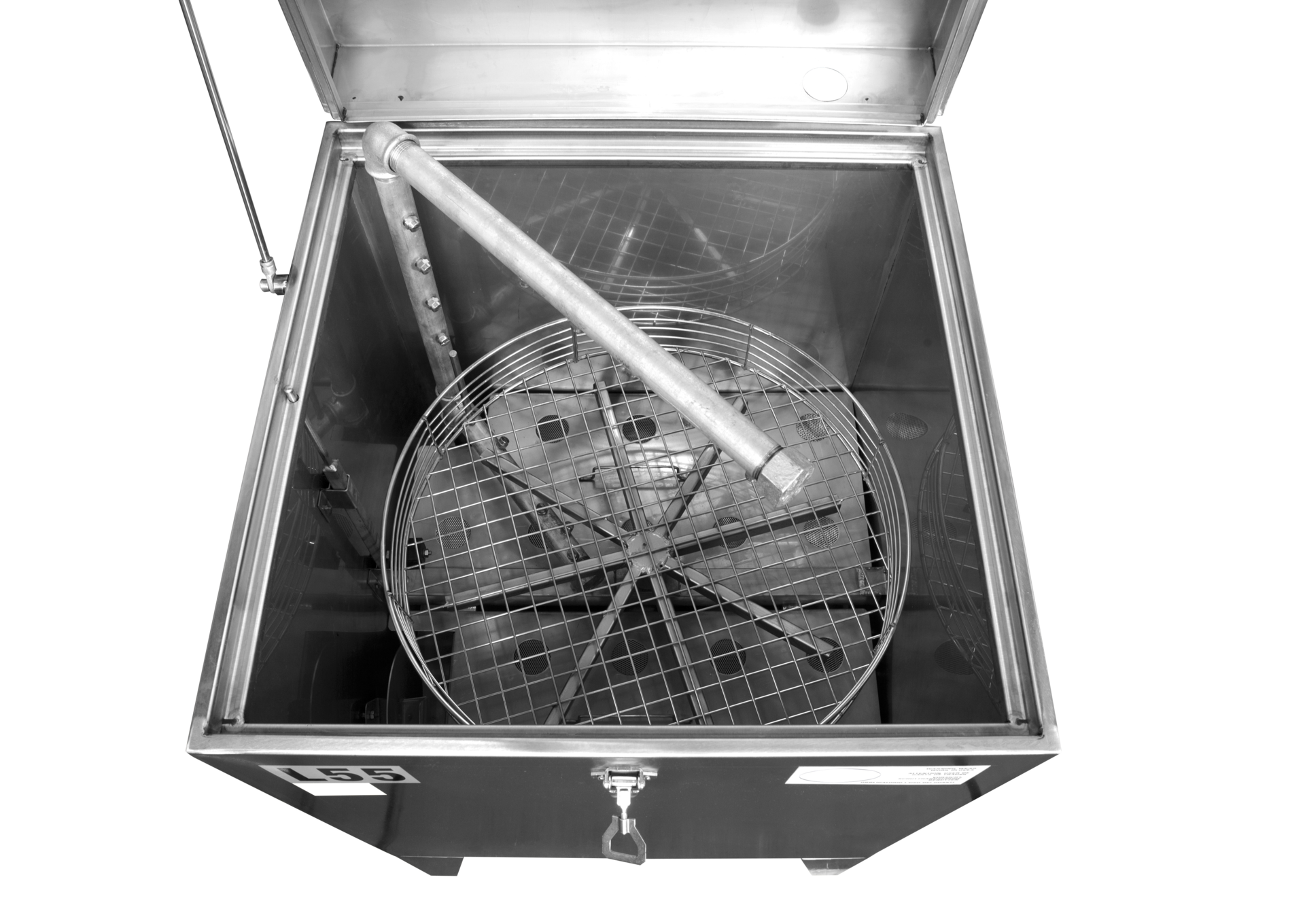 robuste und stabile Edelstahlkonstruktion, zusätzlicher Kleinstteilereinigungskorb aus Edelstahl Ø 170 mm, rotierender Waschkorb aus Edelstahl, Schwadenabzug, Siebblech aus Edelstahl mit Filterkorb über dem Waschtank, Wassermangelsicherung, 1 Pumpe horizontal angeordnet, 3 dreidimensionale Düsenrohre aus Edelstahl