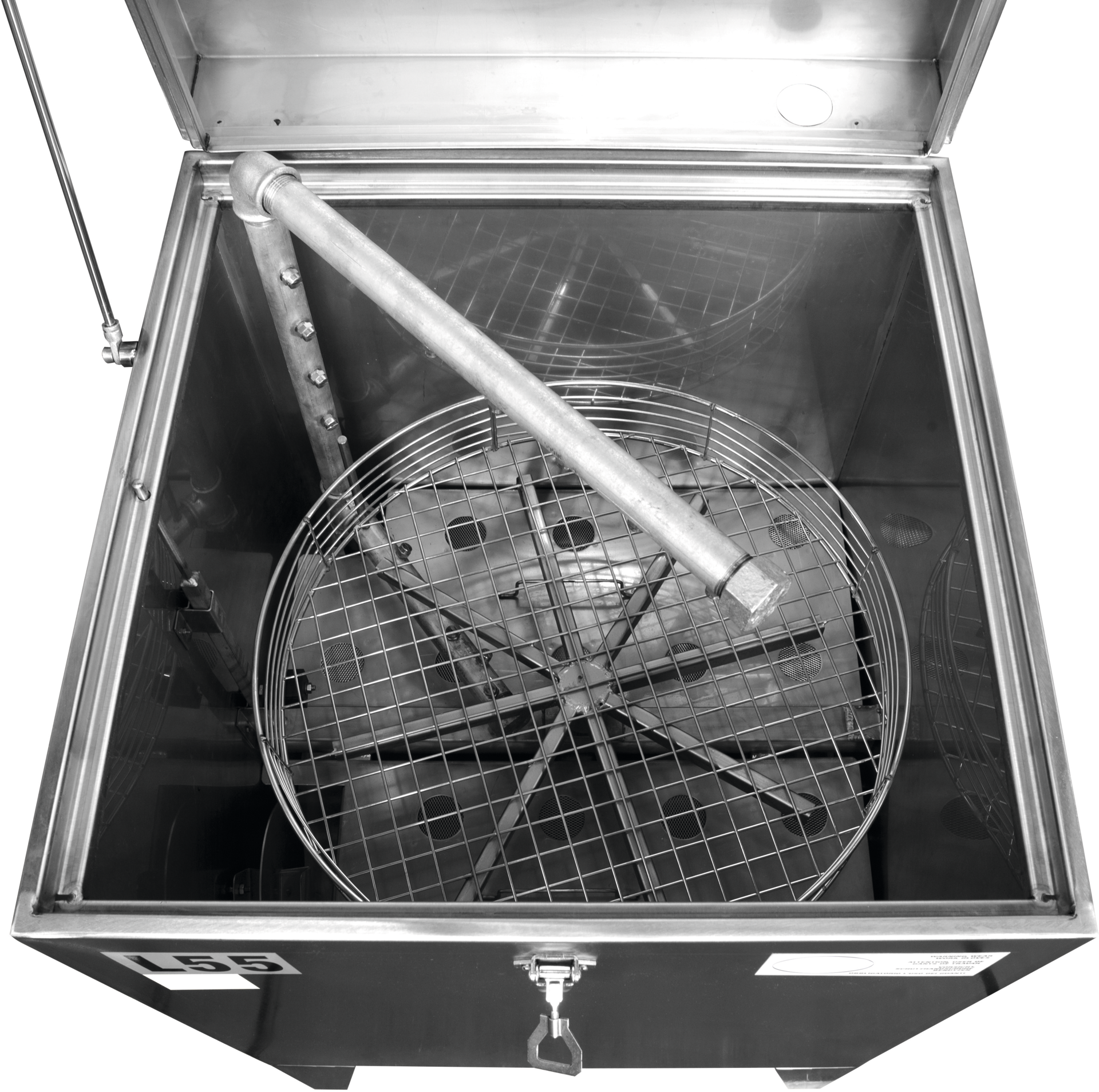 beheizbar bis auf 60 °C, robuste und stabile Edelstahlkonstruktion, zusätzlicher Kleinstteilereinigungskorb aus Edelstahl ⌀ 170 mm, rotierender Waschkorb aus Edelstahl, ab Typ MINI60 400 V motorisch angetrieben, Schwadenabzug, Siebblech mit Filtereinlässen aus Edelstahl über dem Waschtank, Wassermangelsicherung, Typ MAXI91-2 mit 2 Pumpen, doppelte Umwälzung des Waschbades dank 2 Stück dreidimensionalen Düsenbalken