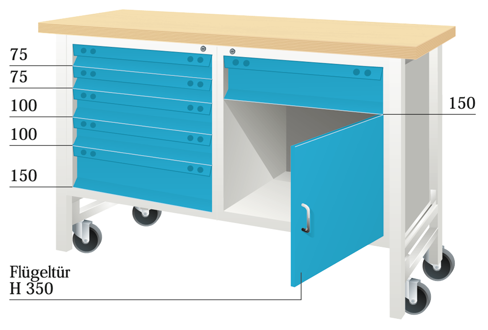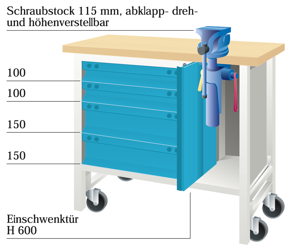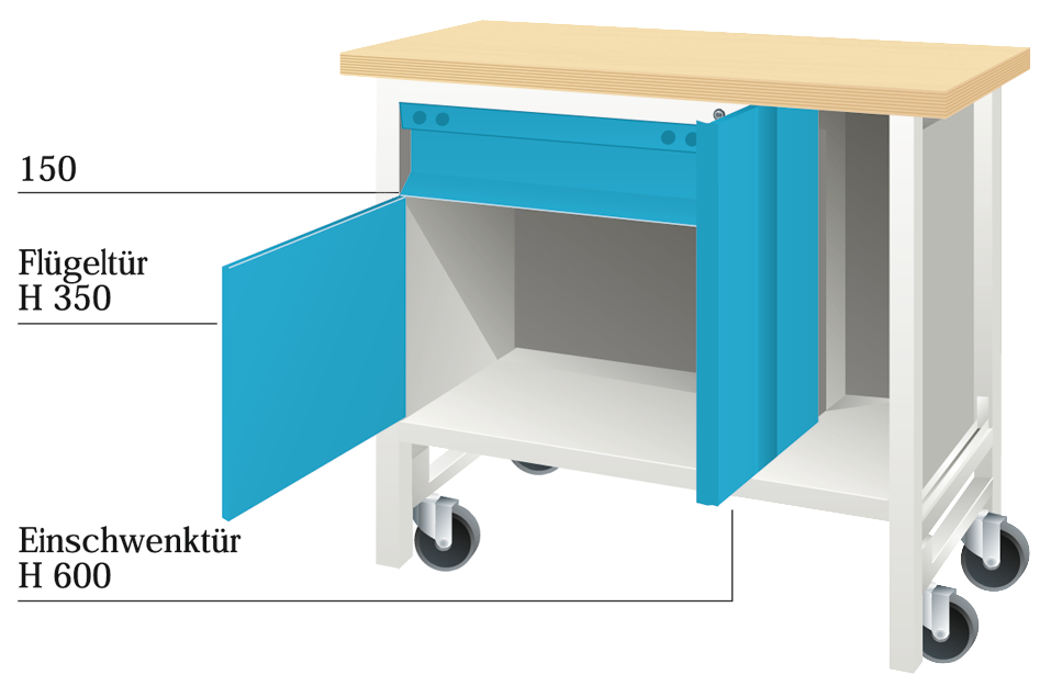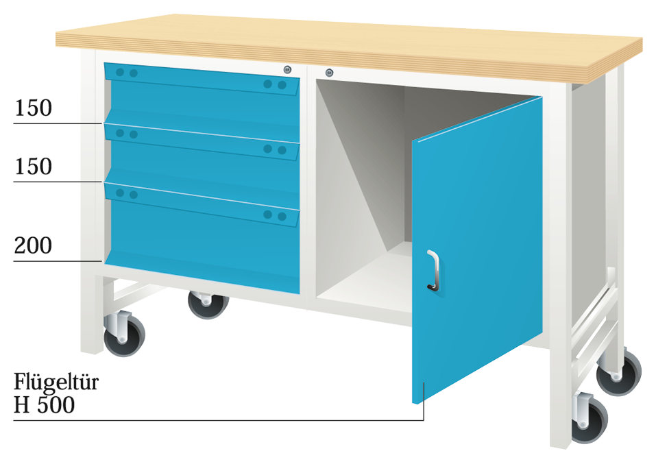 Werkbank Mobil "EYL 1" RAL7035/5012 B1500 x H860 x T700mm 3 Schubladen, 1 Flügeltür