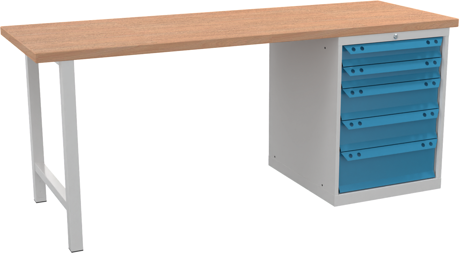 Werkbank Standard "EYL 1" RAL7035/5012 5 Schubladen, 1 Fuß H840 x T700 x B2000mm