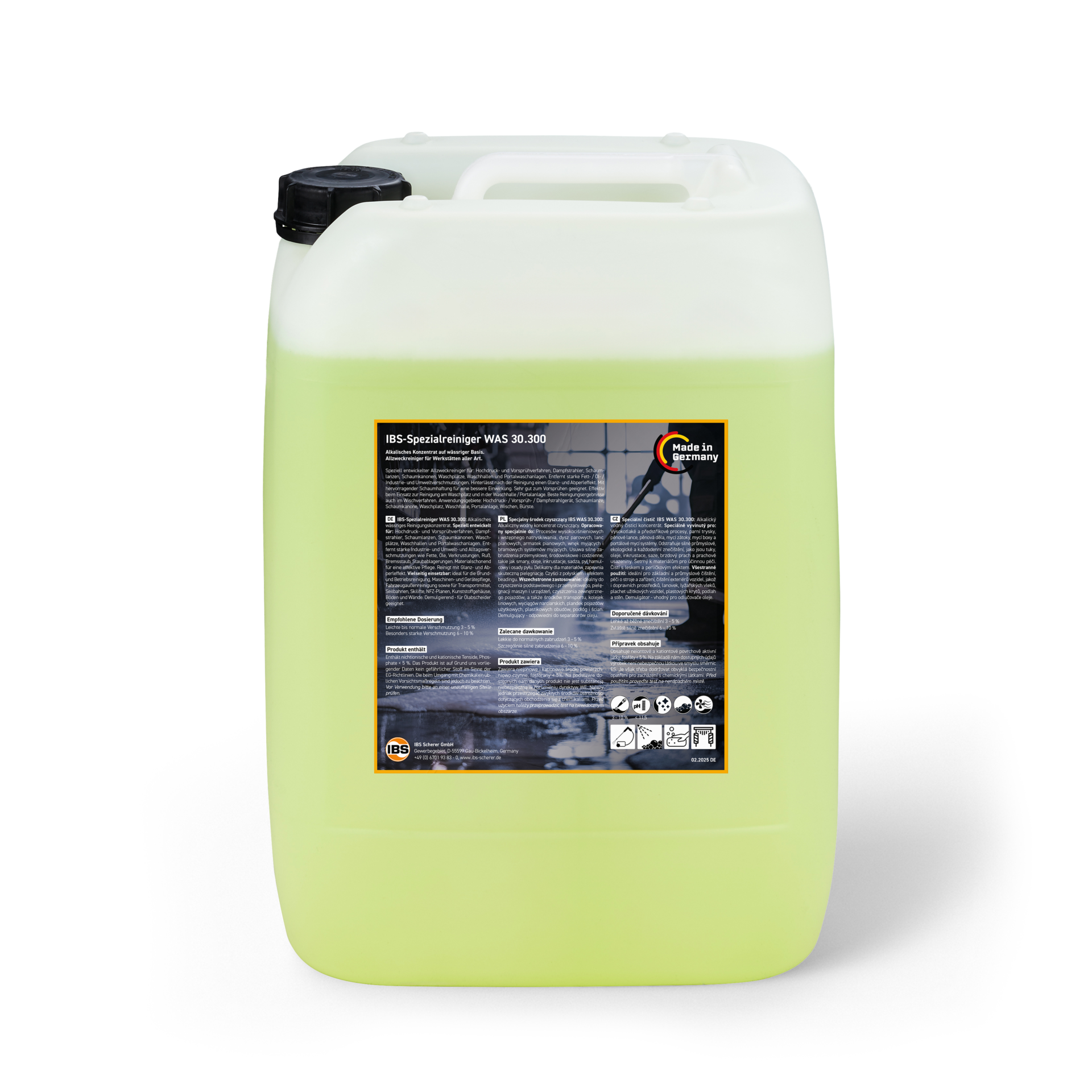 alkalischer Reiniger, sehr gute Schaumhaftung, hinterlässt nach der Reinigung einen Glanz- und Abperleffekt, kennzeichnungsfrei, demulgierend, silikonfrei, leicht biologisch abbaubar
