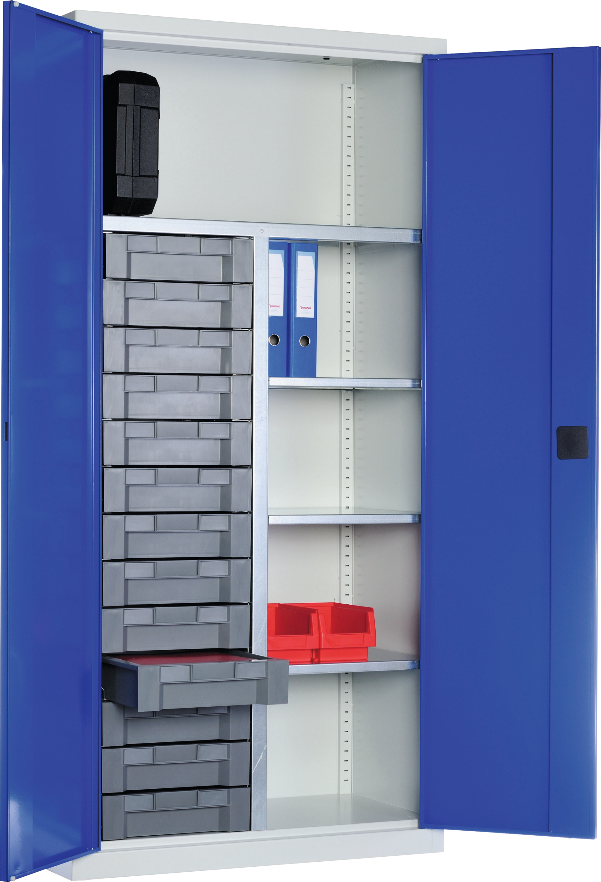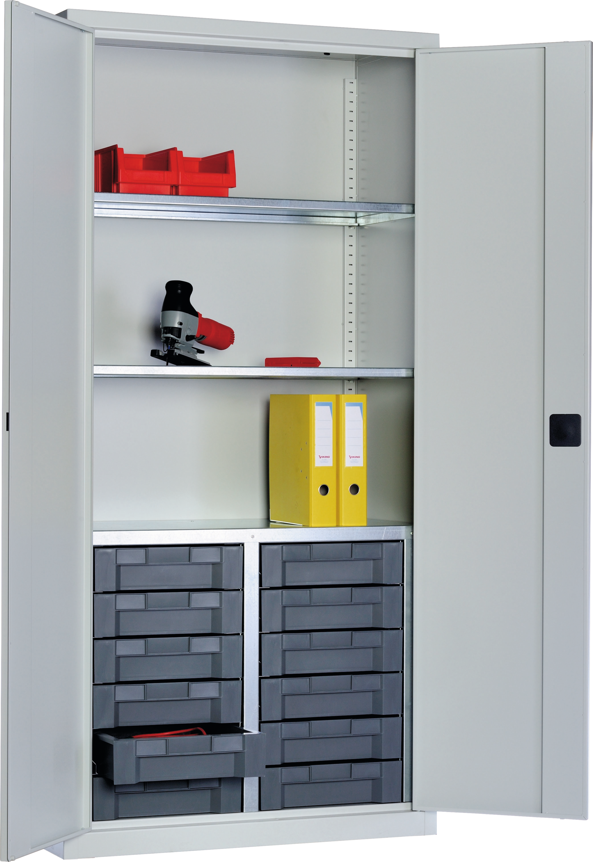 - leichtgängige Schubladen aus schlagfestem Polypropylen im Block mit Mitteltrennwand - Stahlblechgehäuse mit Flügeltüren, Dreipunkt-Verriegelung, Öffnungswinkel 120° - verzinkte Einlegeböden für halbe oder ganze Schrankbreite