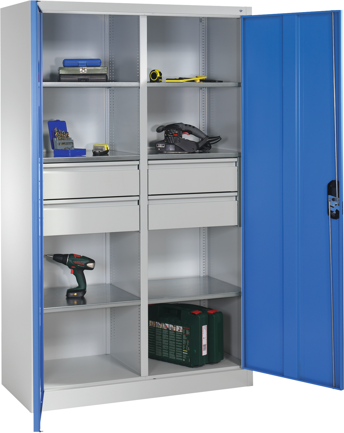 - langlebige, sauber verarbeitete Stahlblechkonstruktion - Türen in Drehbolzen gelagert mit 110° Öffnungswinkel - robustes ERGO-LOCK-Schloss mit zwei Schlüsseln - Einlegeböden im Raster 15 mm höhenverstellbar - Mitteltrennwand und Schubladen immer RAL 7035 lichtgrau - Einbrennbeschichtung in RAL 7035 lichtgrau