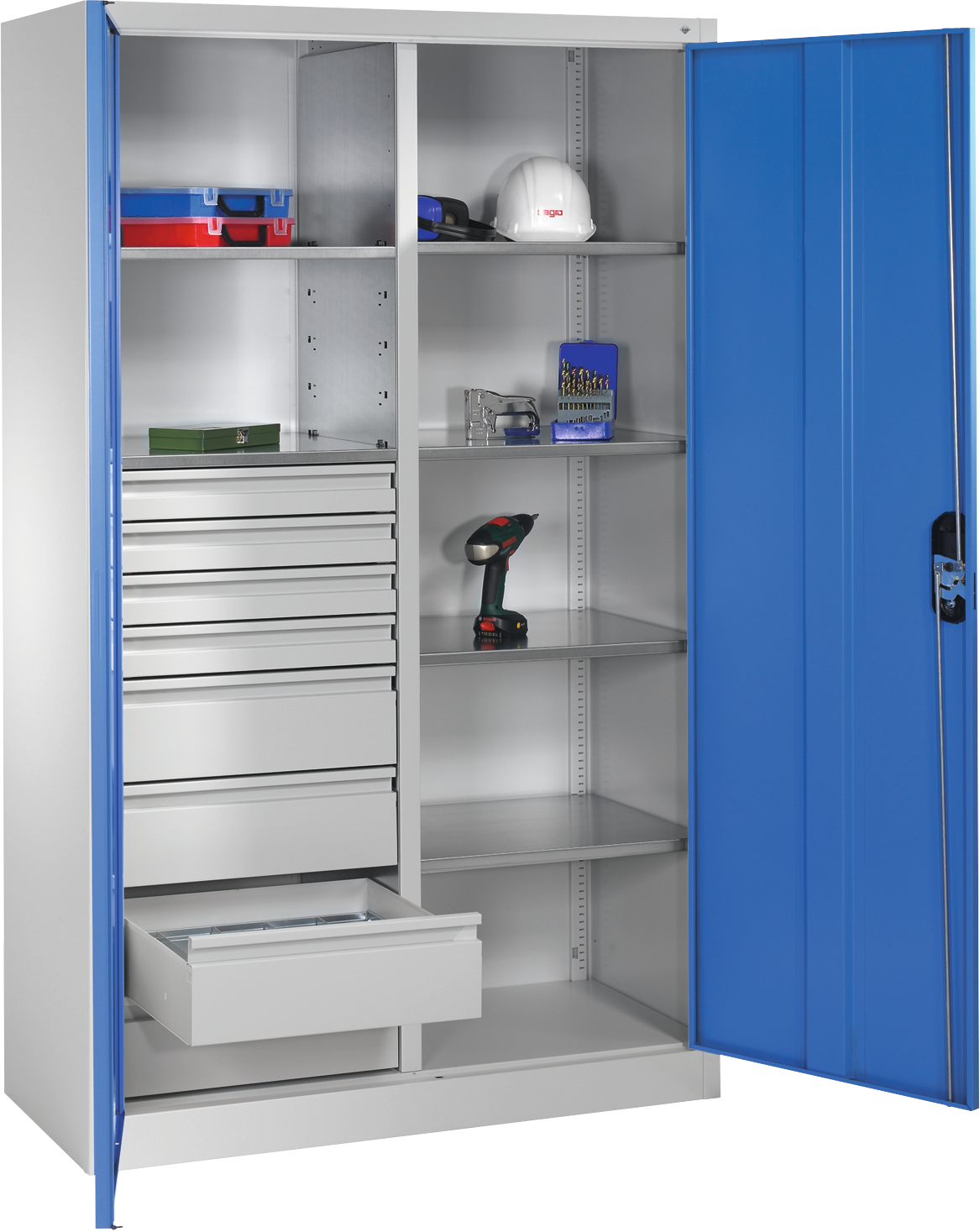 - langlebige, sauber verarbeitete Stahlblechkonstruktion - Türen in Drehbolzen gelagert mit 110° Öffnungswinkel - robustes ERGO-LOCK-Schloss mit zwei Schlüsseln - Einlegeböden im Raster 15 mm höhenverstellbar - Mitteltrennwand und Schubladen immer RAL 7035 lichtgrau - Einbrennbeschichtung in RAL 7035 lichtgrau