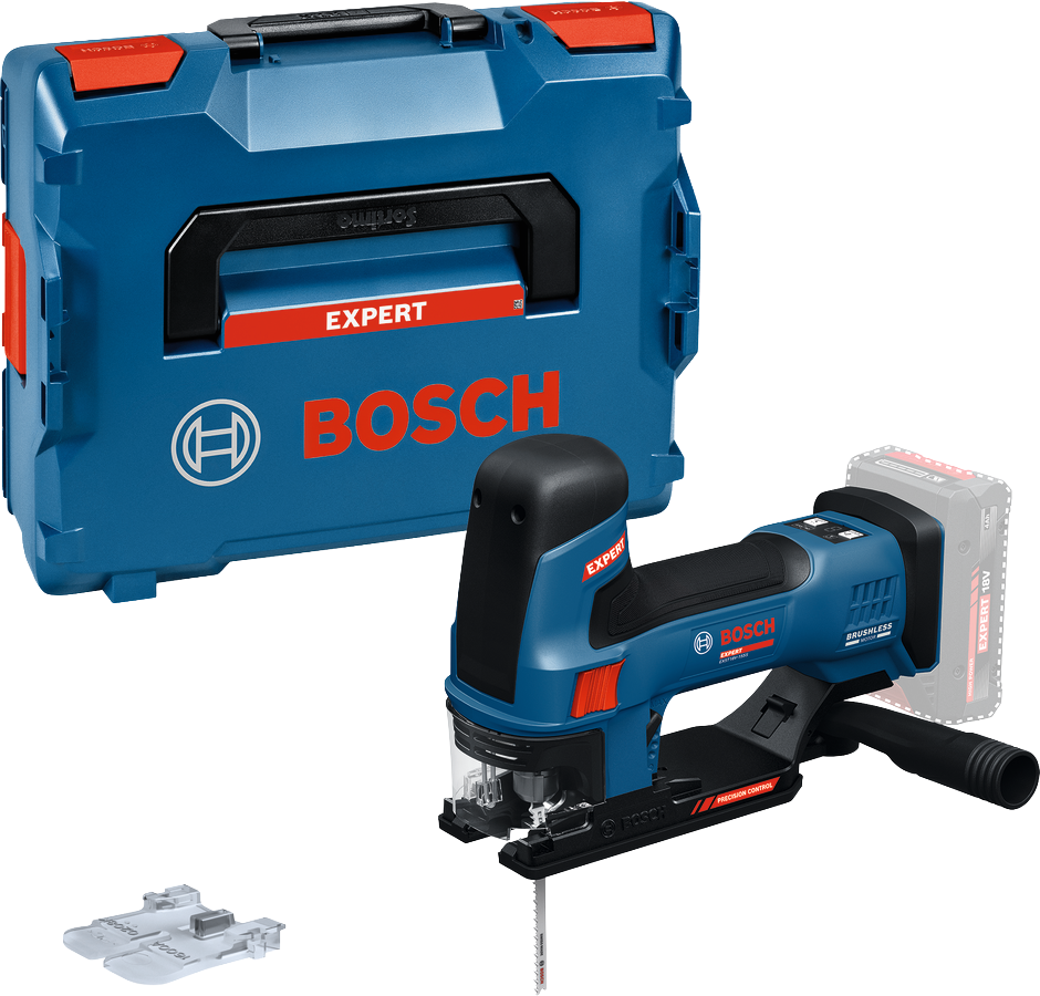 ergonomisches Design, werkzeugloses Bosch SDS-System für problemlosen Sägeblattwechsel, beidseitiger Schalter, einstellbare Pendelvorrichtung, Precision Control, Drop Control, Absaugstutzen, LED-Arbeitsleuchte