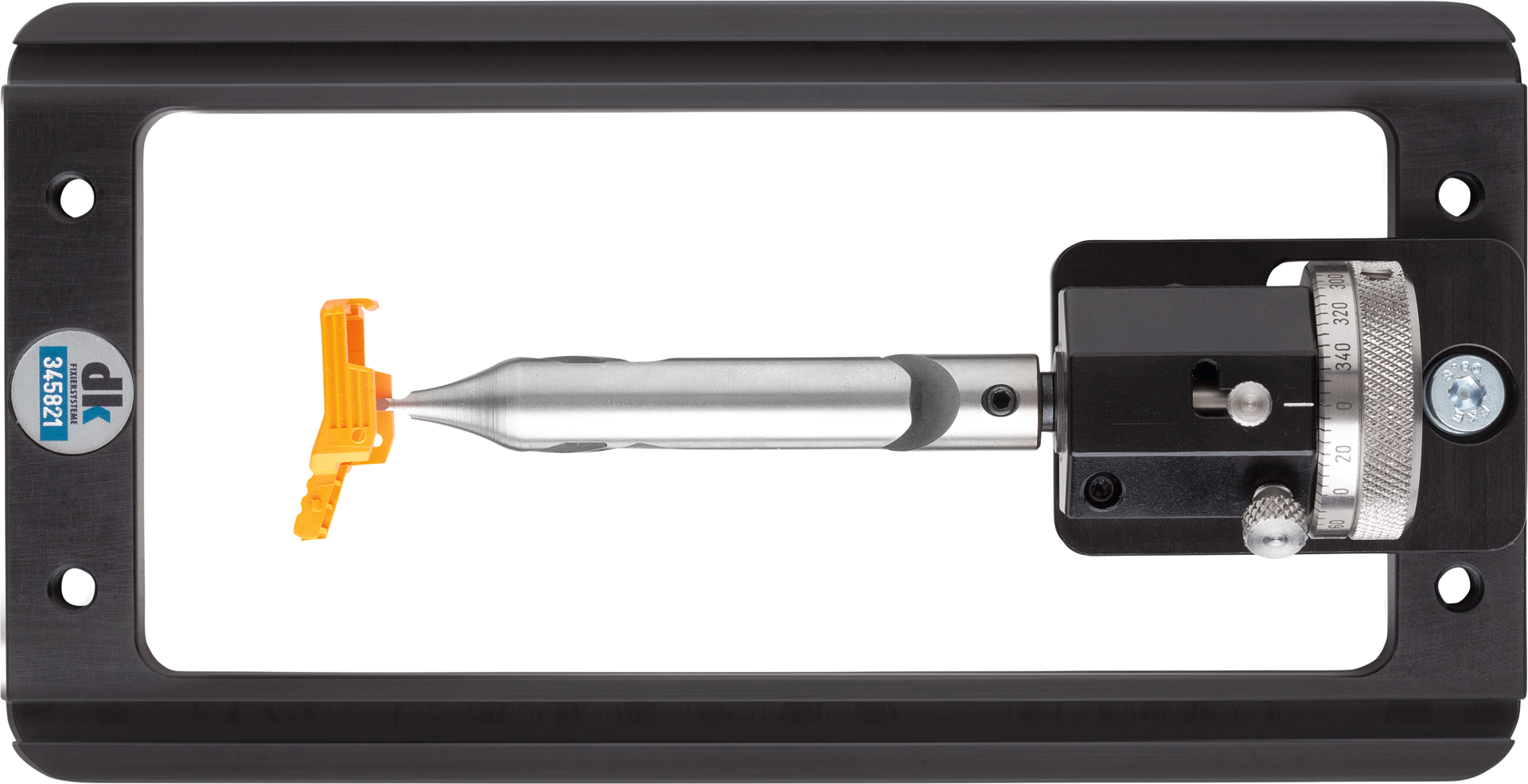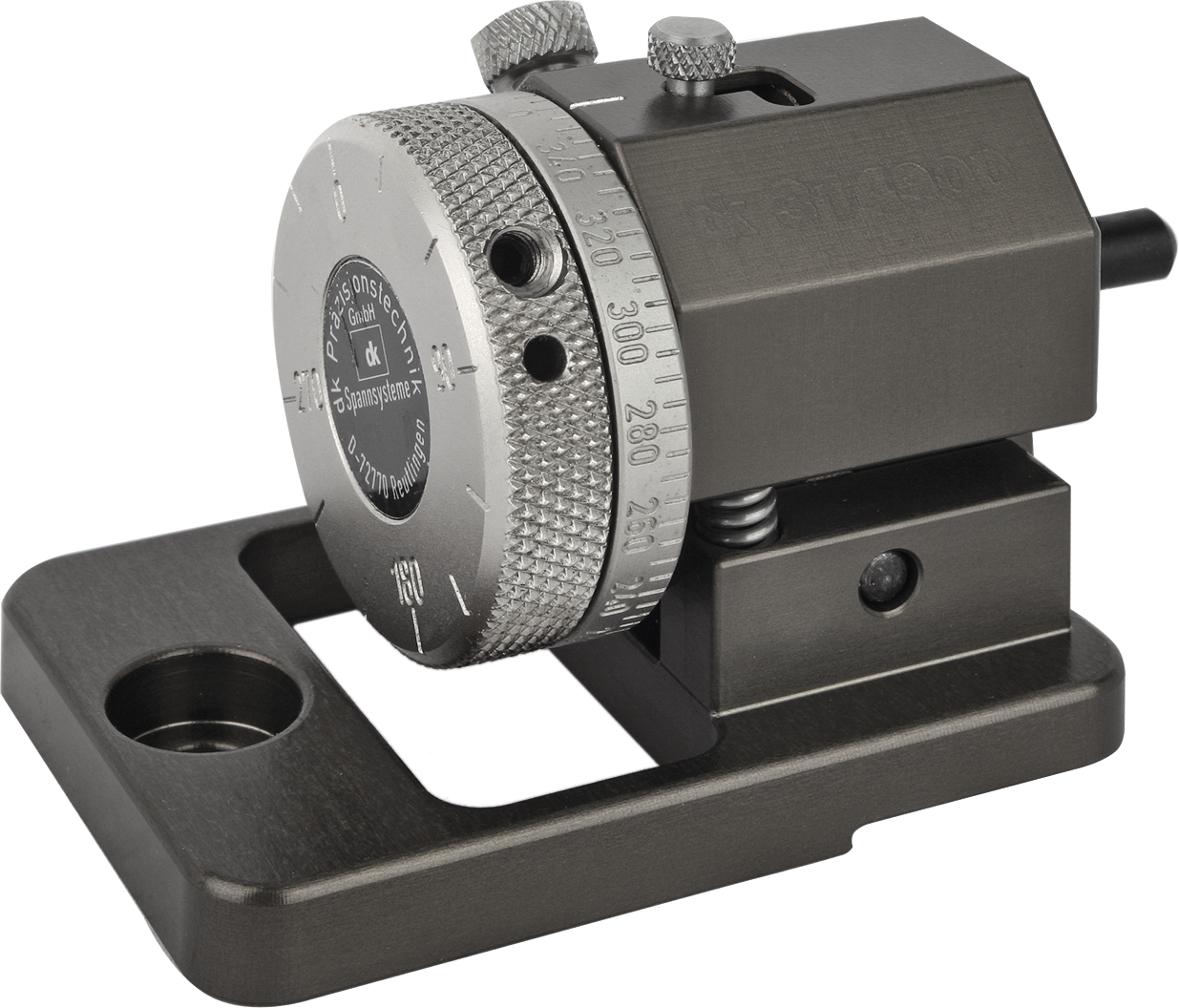 mit Feineinstellung und Raster, Spindel stufenlos drehbar, jede 30° gerastert und in jeder Drehposition klemmbar, Position der Rastung und horizontale Lage der Spindel können durch Feinjustierung ausgerichtet werden