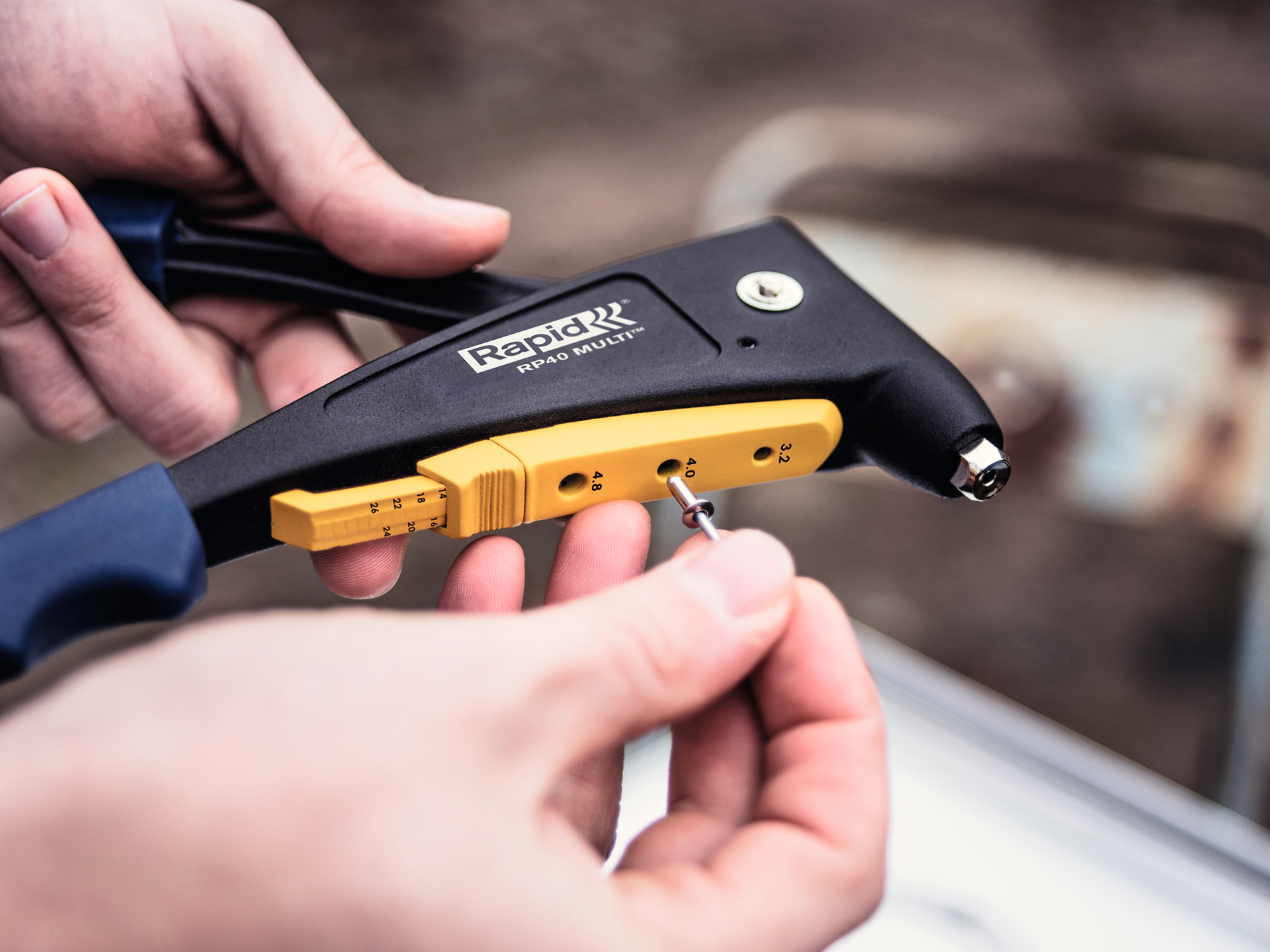 Körper aus Metall-Druckguss, einzigartiges Universalmundstück (keine Wechseln der Mundstücke für verschiedene Nietdurchmesser), Sicherheitsarretierung, integriertes Messwerkzeug zur Ermittlung des Nietdurchmessers und der Materialstärke, Softgriff