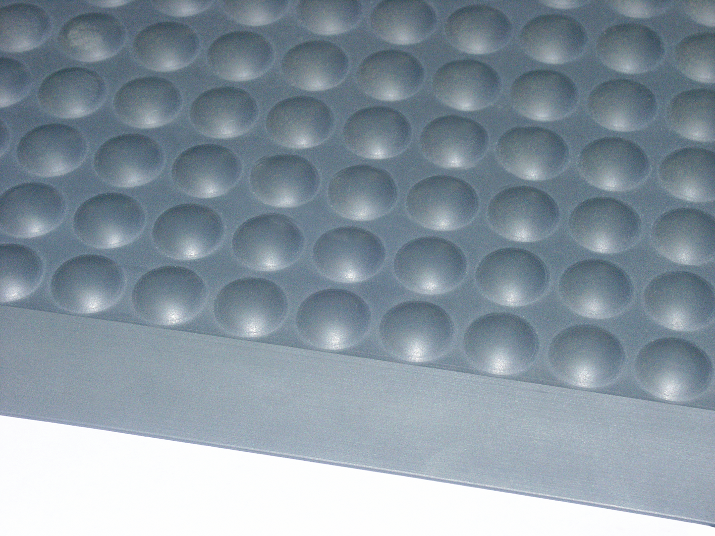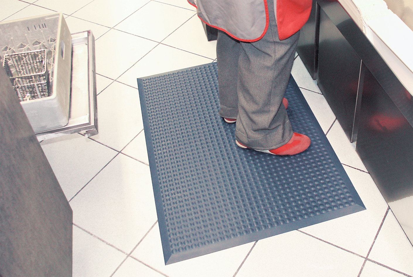 aus Polyurethan, rutschfeste Oberfläche mit kleinen Noppen, die eine massierenden Wirkung haben und durch ständige Bewegungsreize die Muskulatur entlasten, abgeschrägte Ränder, mit Transportgeräten befahrbar, für die Reinigung mit Industriesauger geeignet, isoliert gegen kalte Böden, bedingt beständig gegen Öl und die meisten Chemikalien, temperaturbeständig von -40 bis +80 °C, Bodenbelag braucht nicht verklebt oder fixiert werden